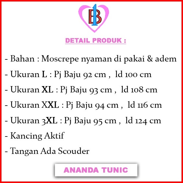 Ananda Tunic Baju Atasan Tunic Fashion Wanita B1-love 60468-67126-64154-66174 L Xl Xxl Xxxl
