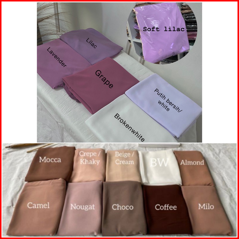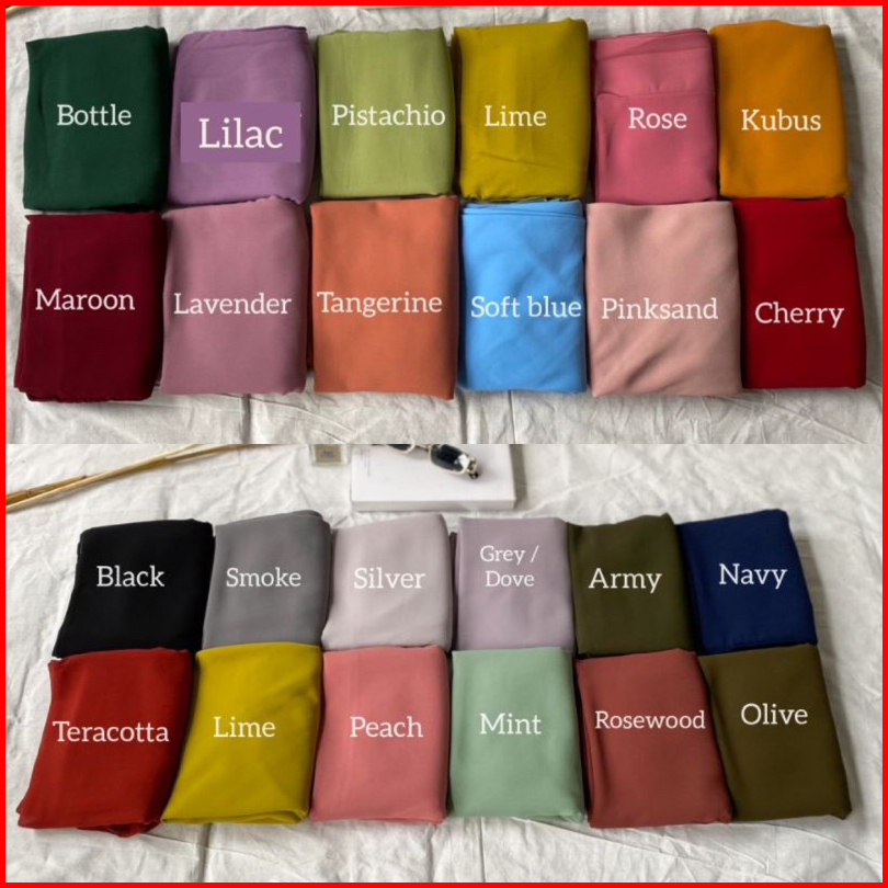 Black, Brokenwhite, Cinnamon, Peach, Bottle, Softblue, Kubus, Olive, Grey, Lime, Maroon, Tangerine, Lilac, Lavender, Silver, Camel, Navy, Pinksand, Smoke, Rosewood, Nougat, Mint, Darkgrey, Cream, Khaky, Milo, Almond, Choco, Mocca, Teracotta, Putih bersih, Grape, Soft Lilac, Army, Avocado