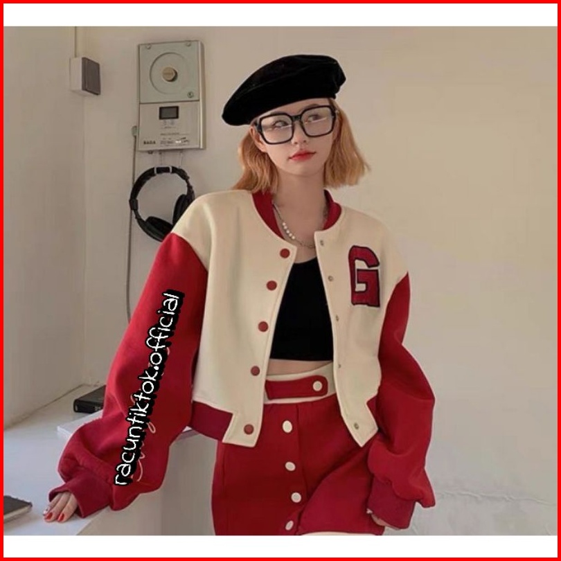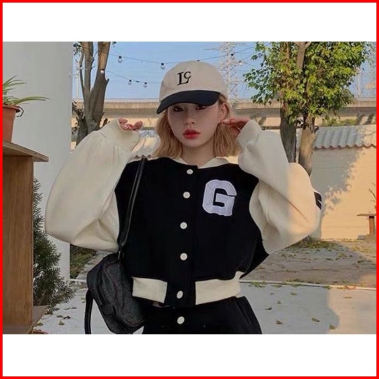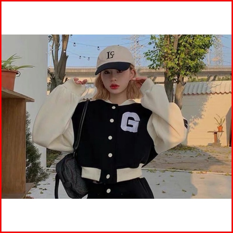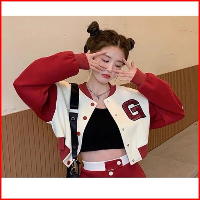 G Baseball Jaket Crop Korean Style Sweatshirt Pakaian Wanita Bahan Fleece Tebal Jaket Varsity