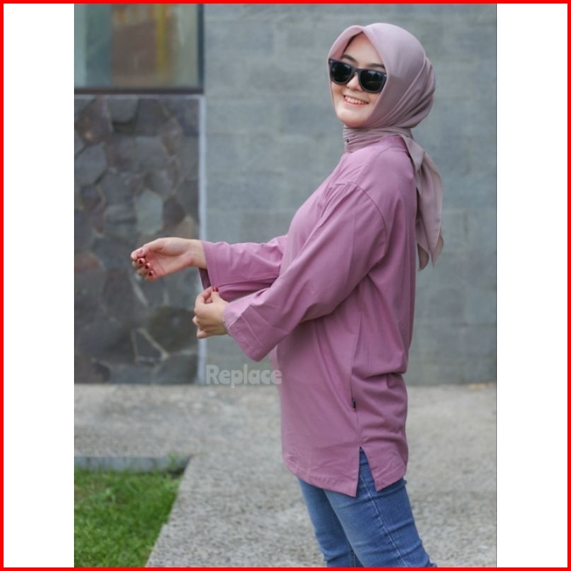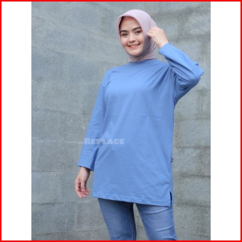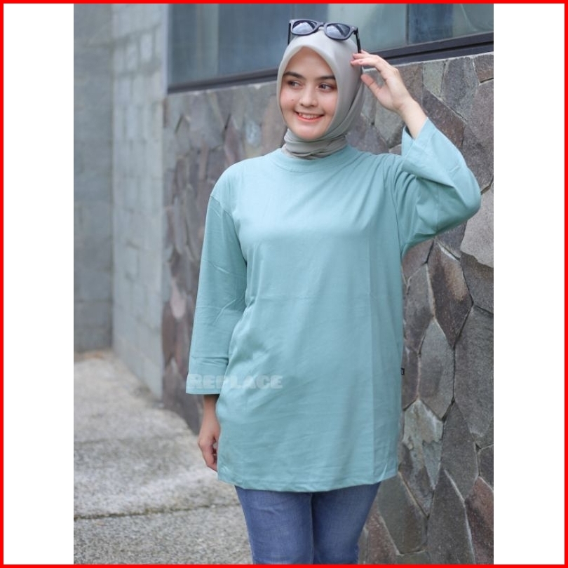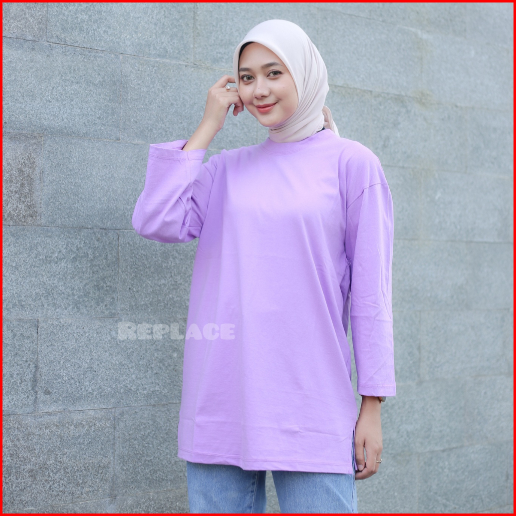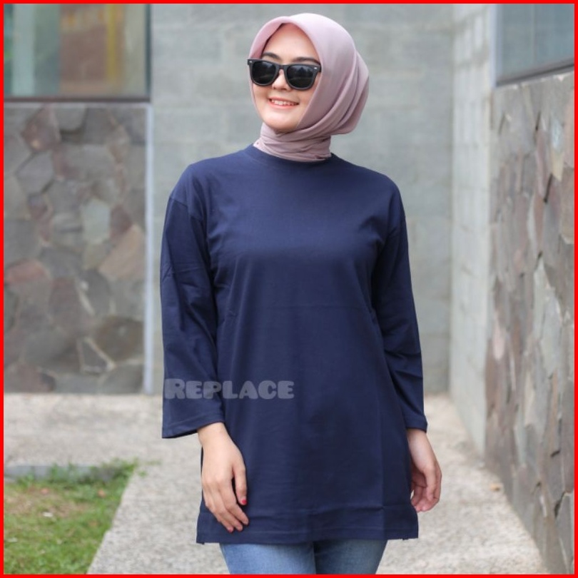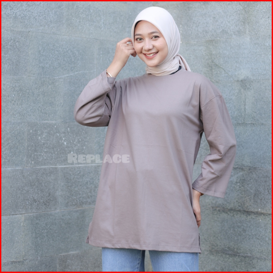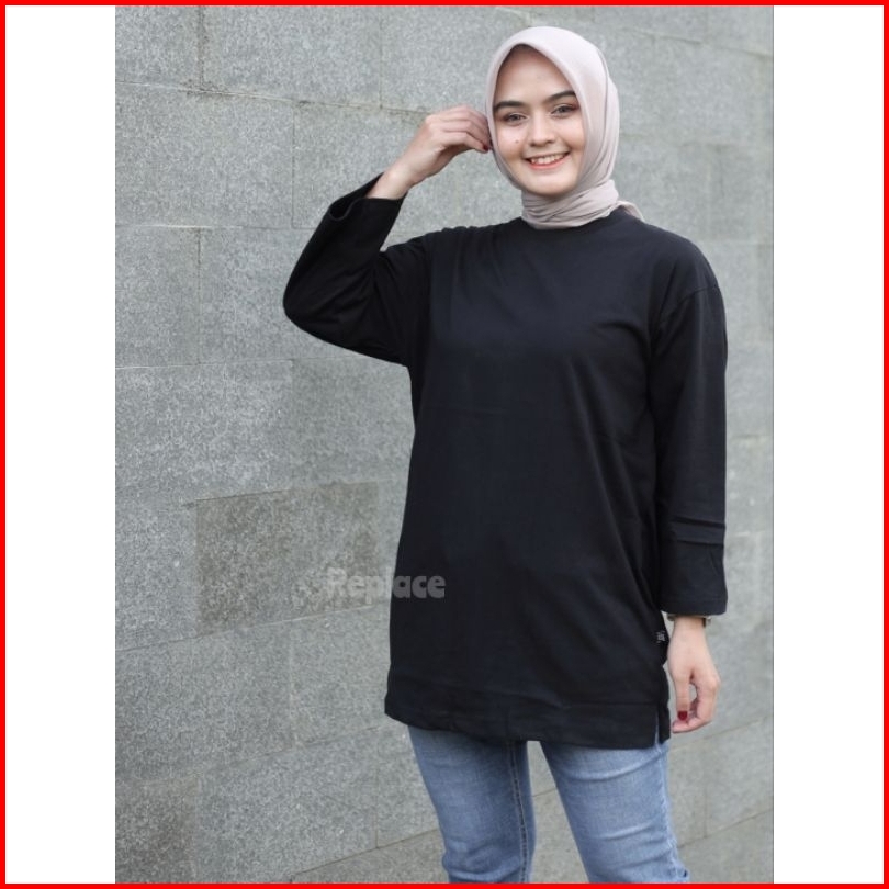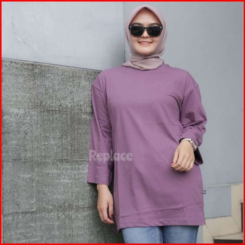 Kaos Oversize Wanita Slit Atasan Jumbo Lengan Panjang 7 8 Hijab Style