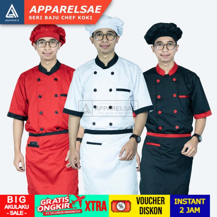 BAJU KOKI SERAGAM CHEF FULL SET BAHAN JAPAN DRILL LEMBUT PREMIUM PENDEK BAHAN PREMIUM