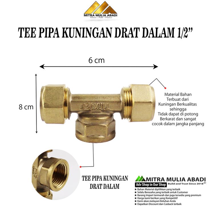 Tee Pipa Air Panas Kuningan Drat Dalam 1/2" / Sambungan Pipa Kuningan