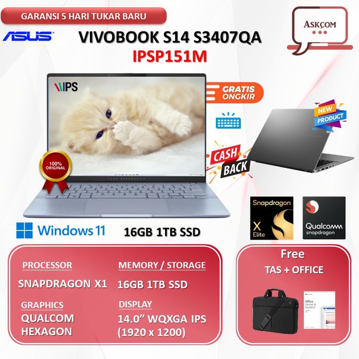 Asus VivoBook S14 S3407QA SNAPDRAGON X1 16GB 1TB SSD W11 OHS21+M365B 14.0WQXGA IPS IPSP151M