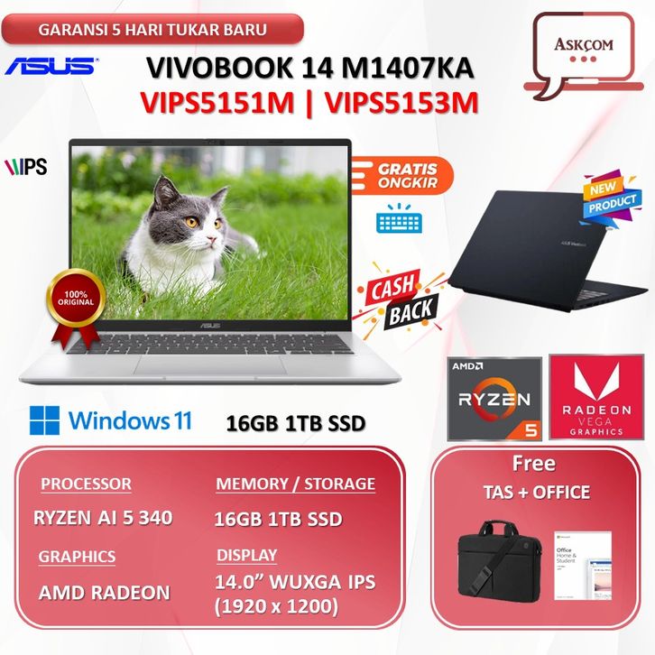 Asus VivoBook 14 M1407KA RYZEN AI 5 340 16GB 1TB W11+OHS+M365B 14.0 WUXGA VIPS5151M | VIPS5153M