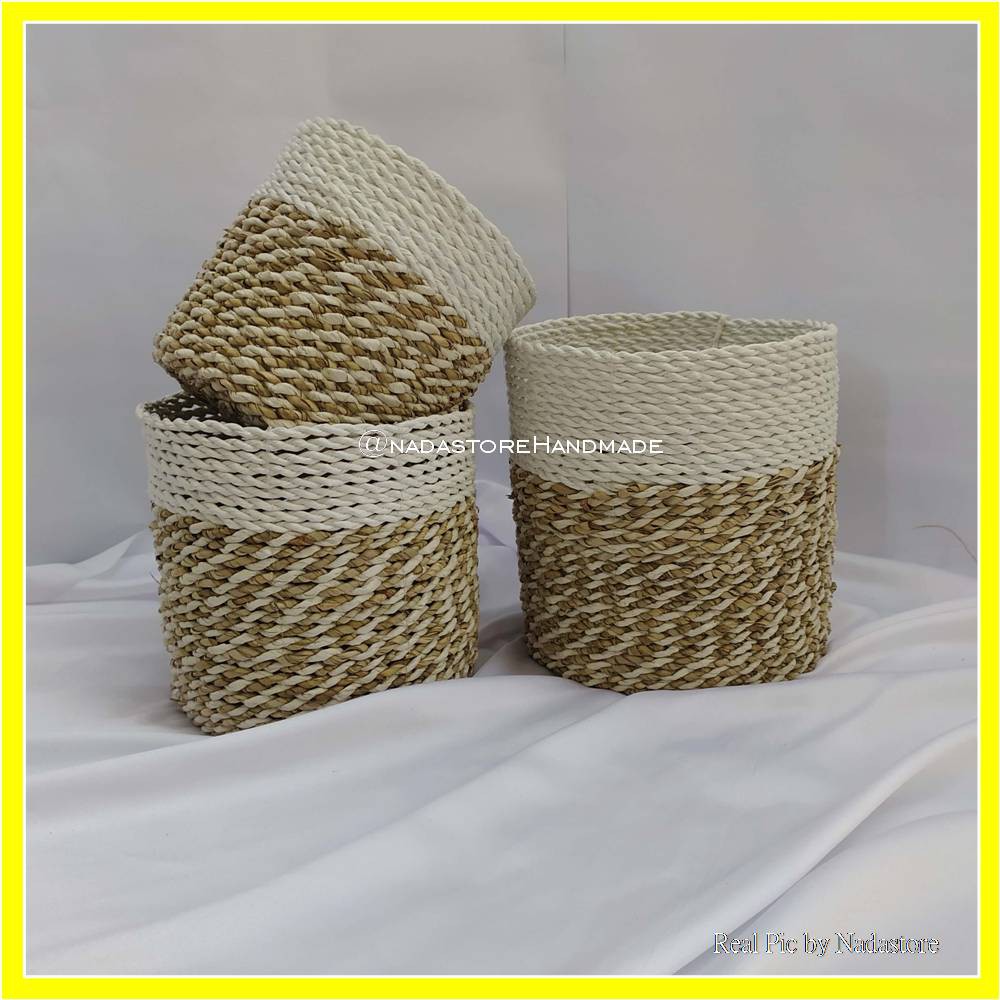 KERANJANG ANYAMAN SEAGRASS ISI 3 / COVER POT MINI MOTIF LURIK 3 IN 1