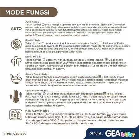 GEA Baby Multifunction Warmer Sterilizer Dryer GSD-200 Penghangat Susu & Makanan Steril Botol Bayi Pengering Botol Susu