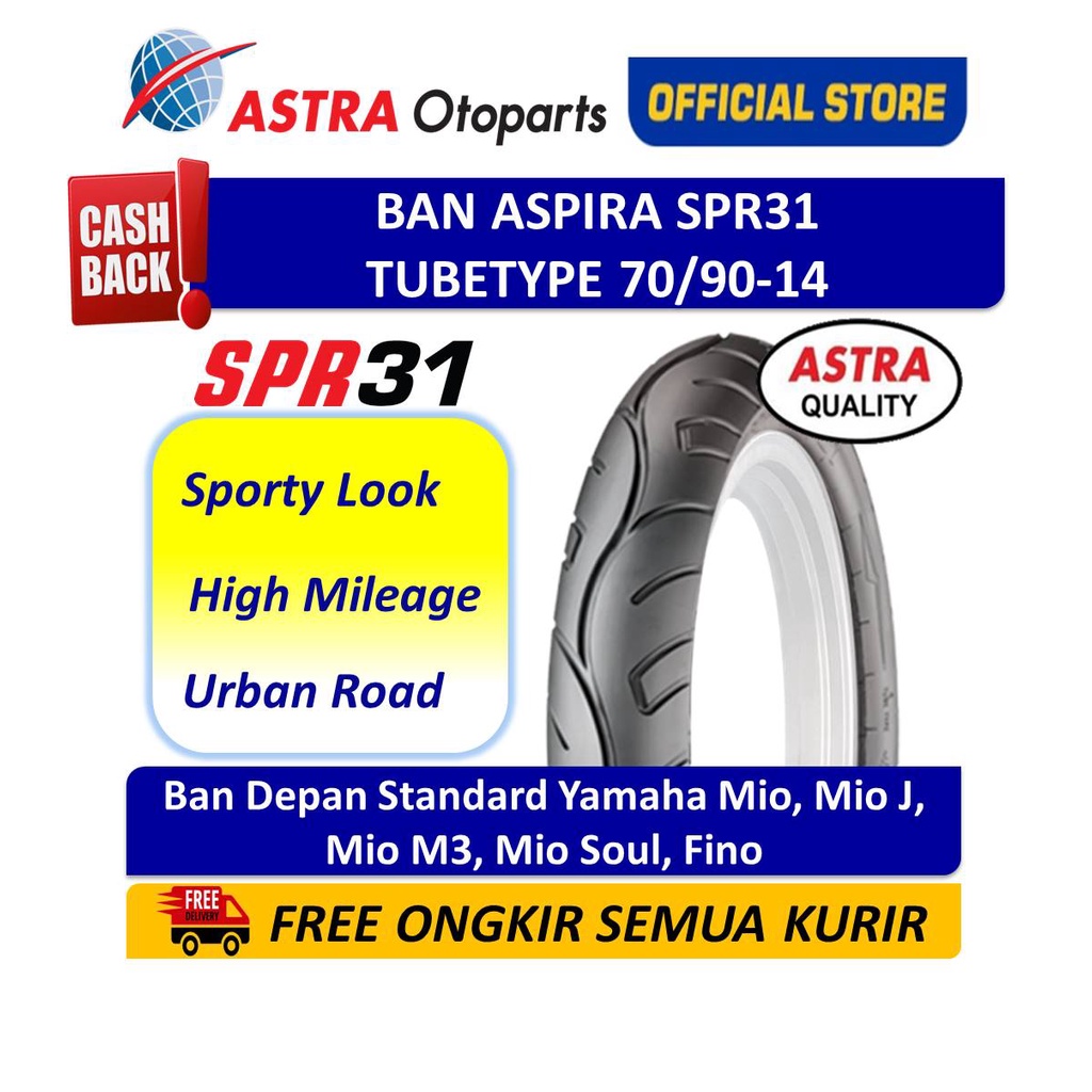 BAN ASPIRA SPR 31 TUBE TYPE 70/90-14 UNTUK BAN DEPAN STANDARD YAMAHA MIO, MIO J, MIO M3, MIO SOUL, FINO, FINO (FI)