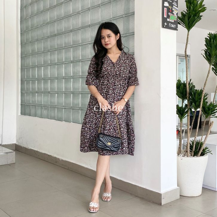Hera Dress Gaun Motif Bunga Lengan Pendek Wanita Crinkle Airflow Anti Lecek Korean Style Terbaru Kekinian Ootd by Clashe