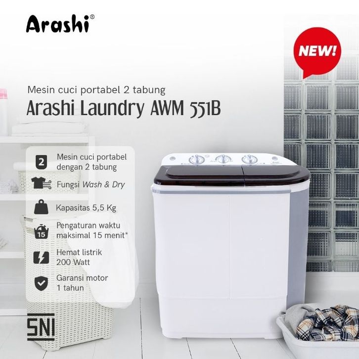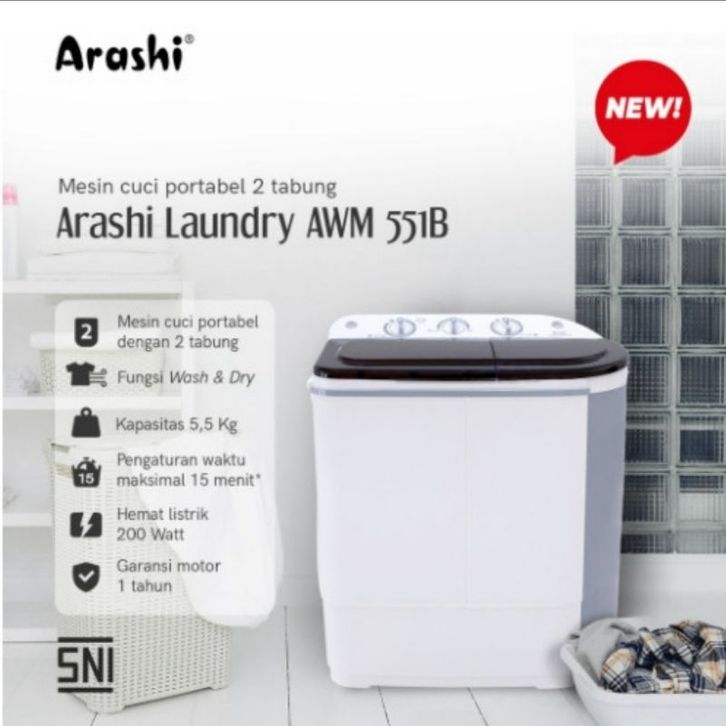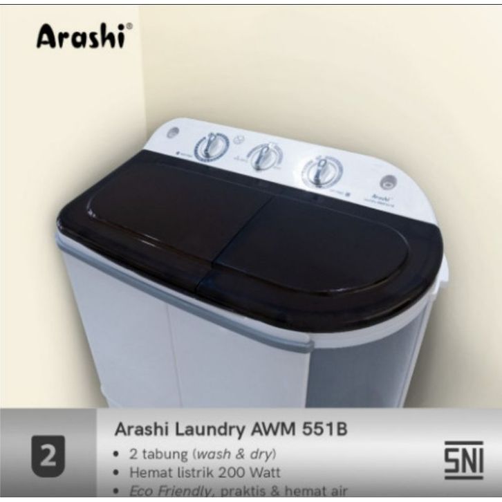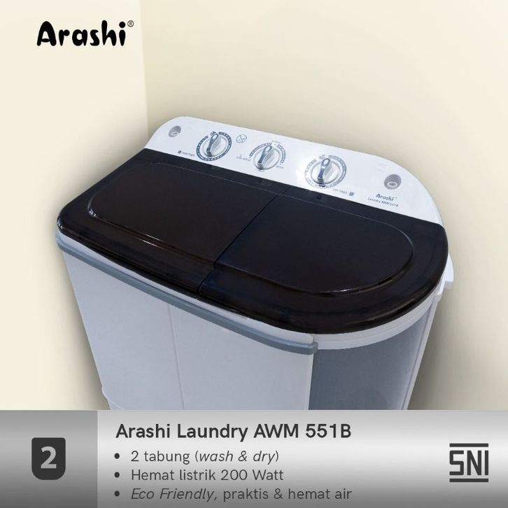 Mesin Cuci 2 Tabung Arashi Awm 551b 5.5 Kg Murah Hemat Listrik