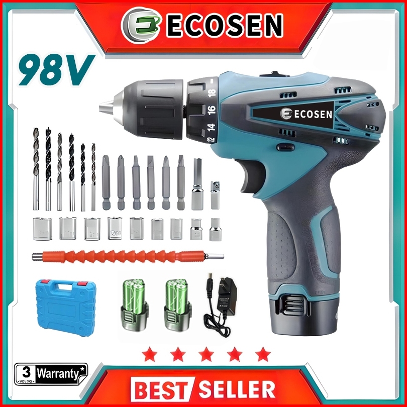 Ecosen 98v Mesin Bor Baterai Tangan Dengan 2 Baterai Cordless Drill Battery Impact Drill Alat Portable Nirkabel Bor Bate