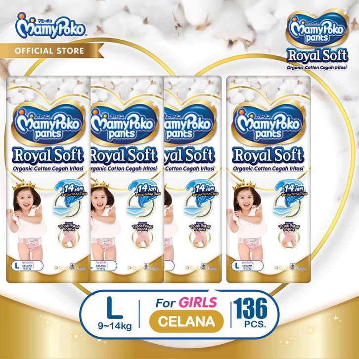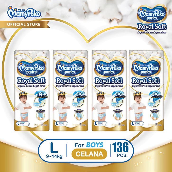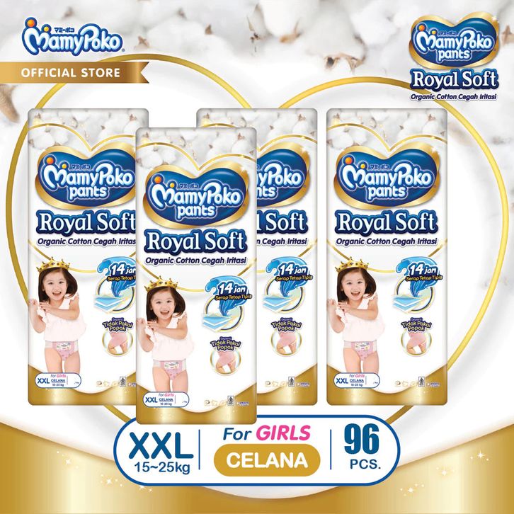 Paket 4 Packs MamyPoko Royal Soft S46 M42 L34 XL30 XXL24 Size Boys/Girl 1 Karton (4 ball)