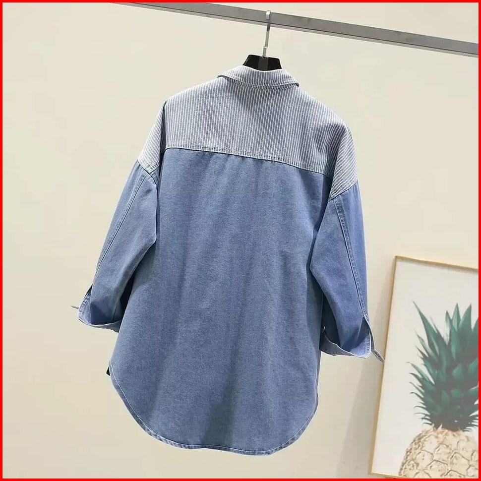 960 - Kemeja Jeans Denim Atasan Wanita Kombinasi Salur