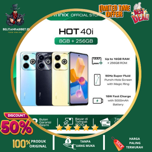 (BEST SELLER ) Infinix Hot 40i 8/256GB - Up to 16GB Extended RAM - Unisoc T606 - 90Hz Punch Hole - 50MP AI Lens - 5000 m