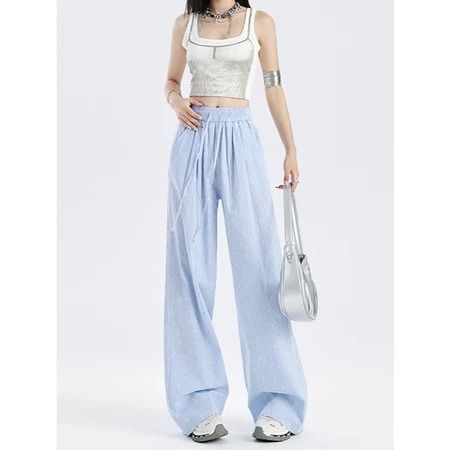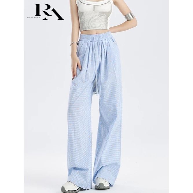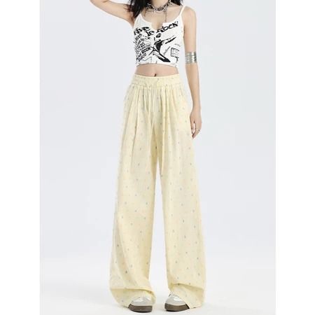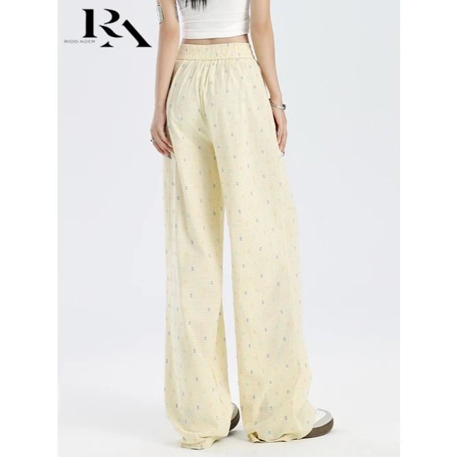 RIOD AOER Celana kasual lurus jacquard polkadot dopamin kuning celana panjang kaki lebar ramping pingga