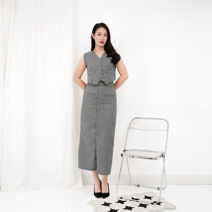 SETELAN VEST ROK WANITA MIDI SEMIWOLL BAJU SET ROMPI CEWEK KEKINIAN TERBARU