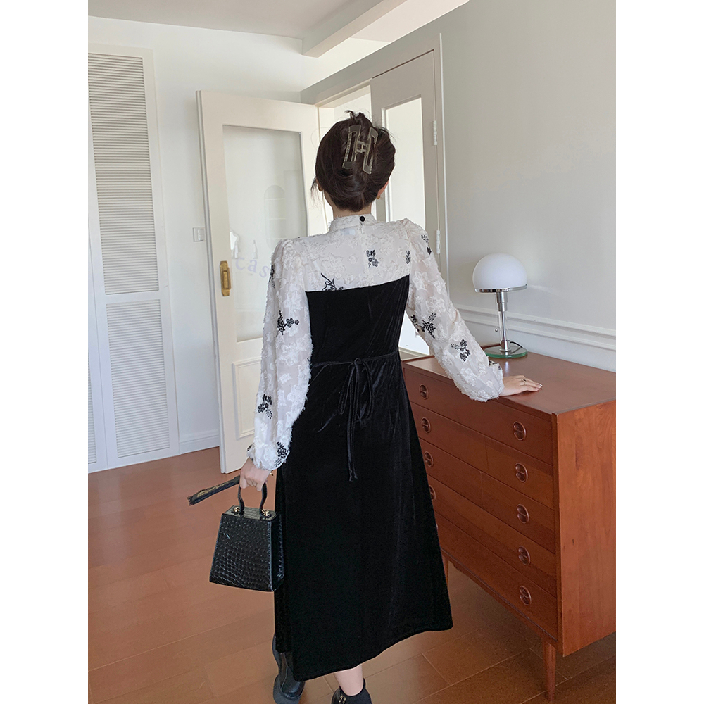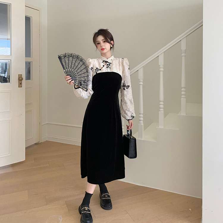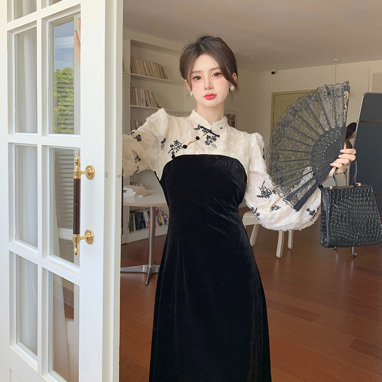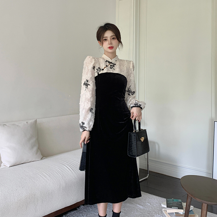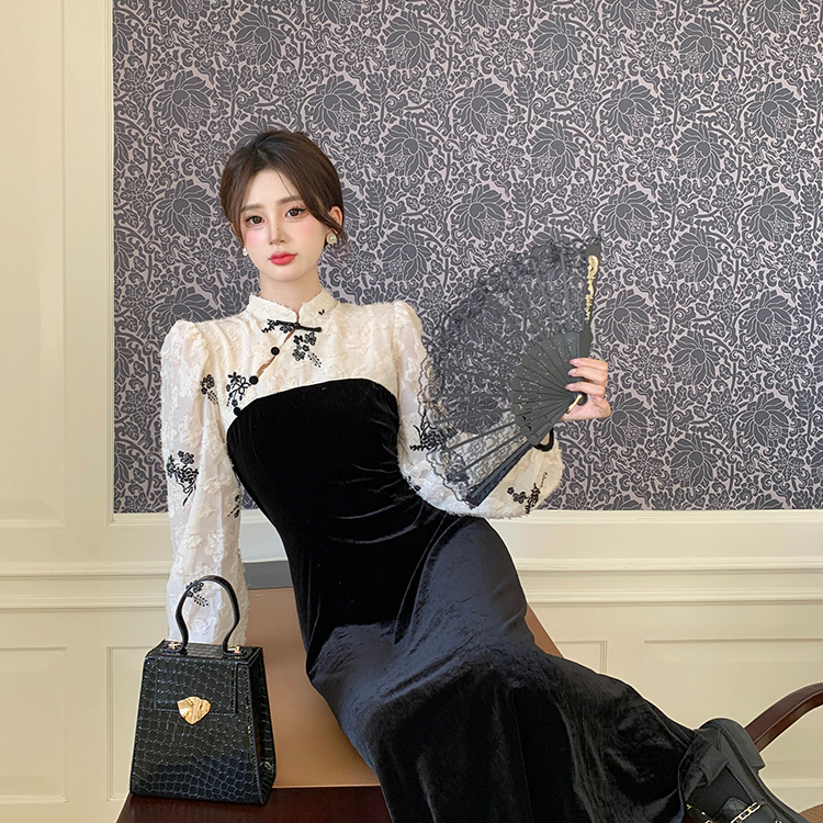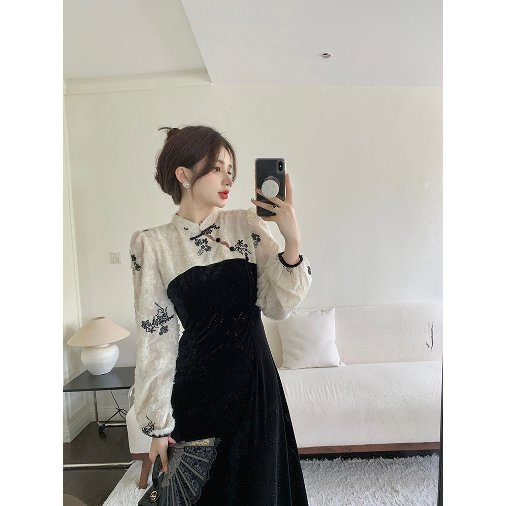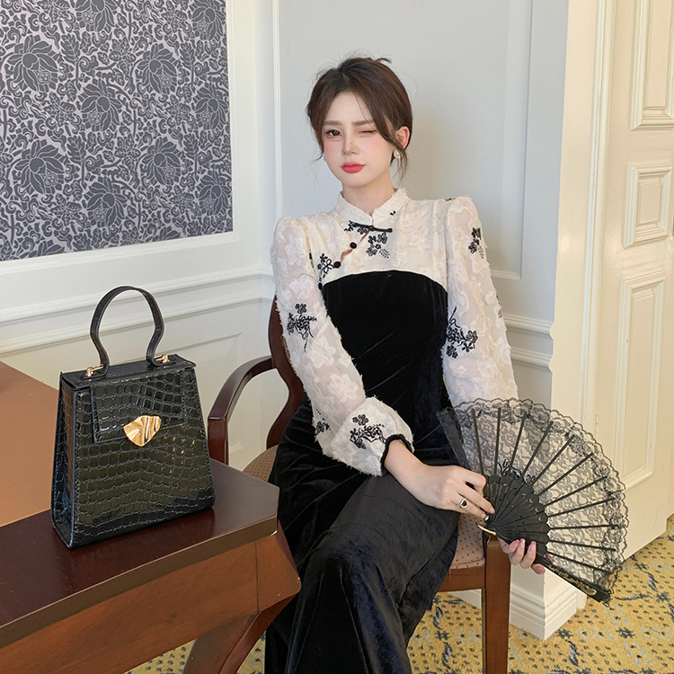 KERAH STAND-UP RENDA SPLICING BELUDRU GAUN CHEONGSAM HITAM WANITA GAUN BUNGA BARU DRESS