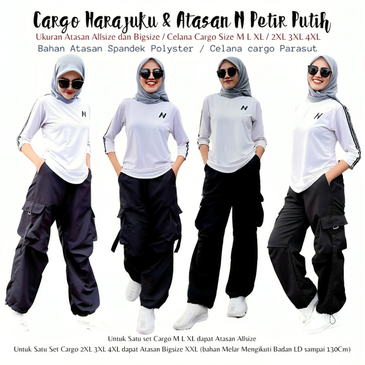 BAJU SETELAN OLAHRAGA WANITA MUSLIM ATASAN PUTIH DENGAN CARGO HITAM BAHAN PARASUT UNTUK OLAHRAGA ZUMBA AEROBIK UNISEX