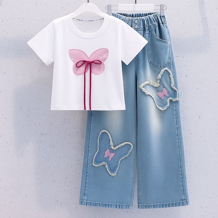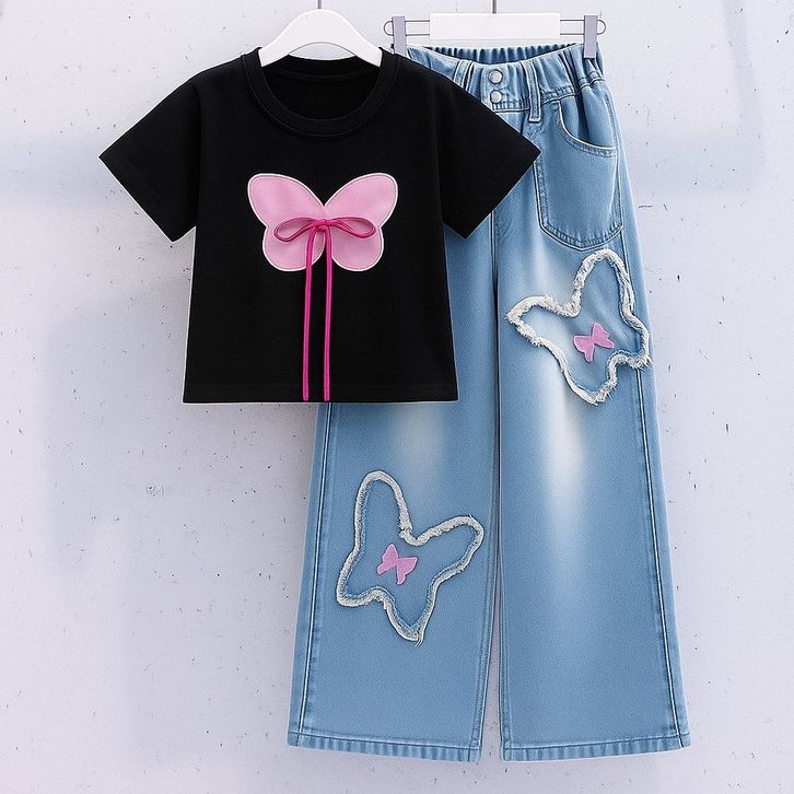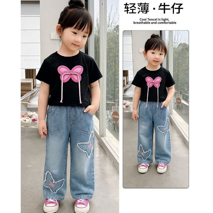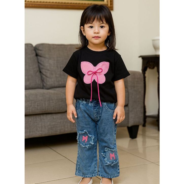 Setelan Anak Perempuan Kekinian Bahan Katun Dengan Celana Denim Panjang Motif Kupu Pita Usia 6 Bulan - 5 Tahun