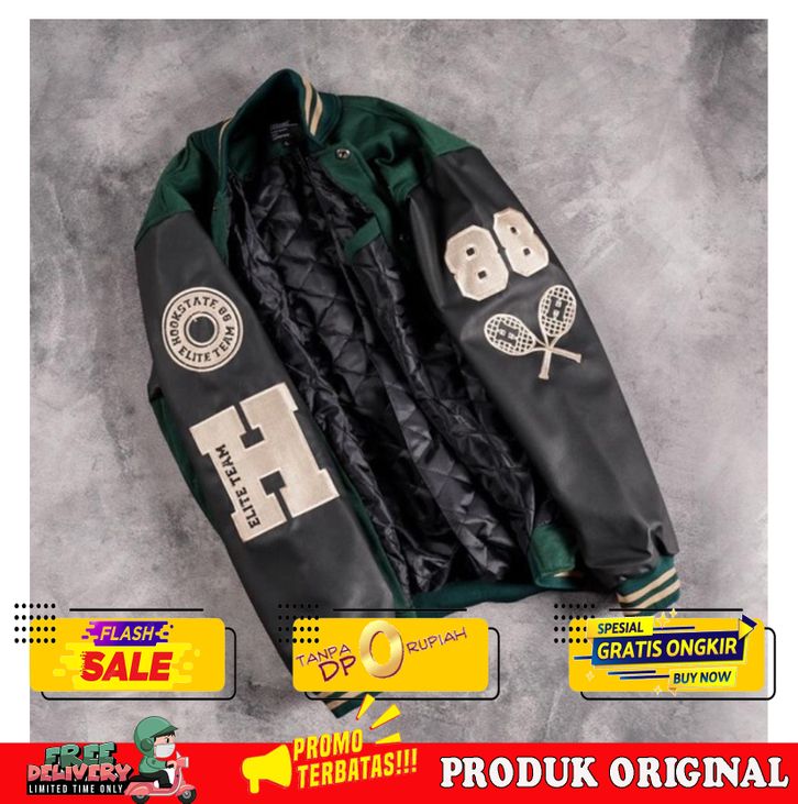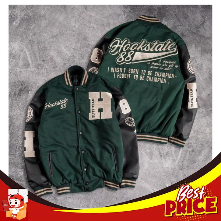 BARU [N00395] JAKET BASEBALL VARCITY DISTRO MOTIF HOOKSTATE 88 H ELITE TEAM - HIJAU BOTOL, M