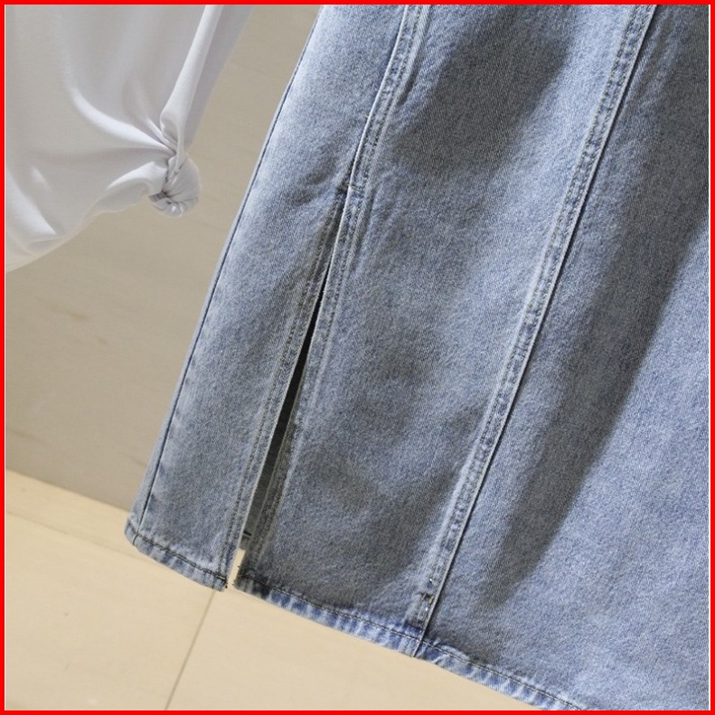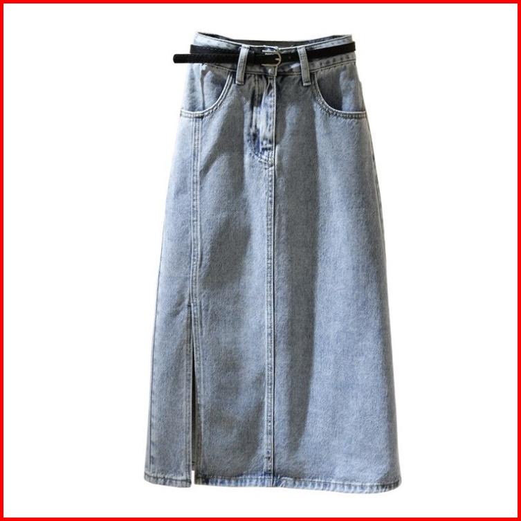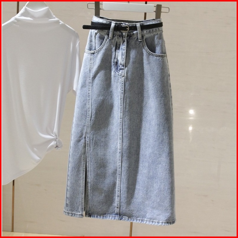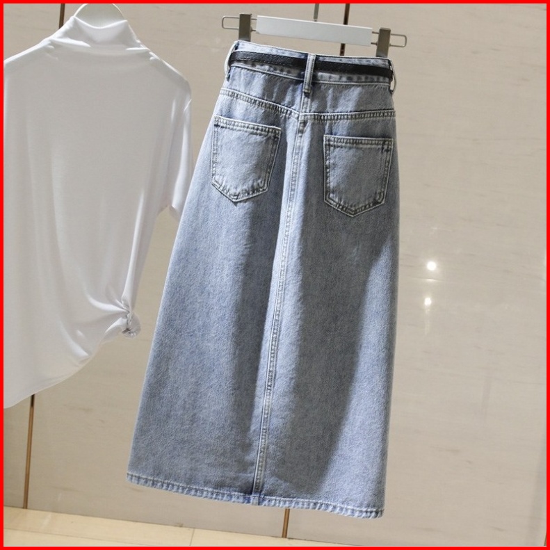 Rok Denim Pinggang Tinggi Biru Muda Wanita Mid-length Rok Fashion Gaya Baru Rok Pelangsing Pinggul A-line