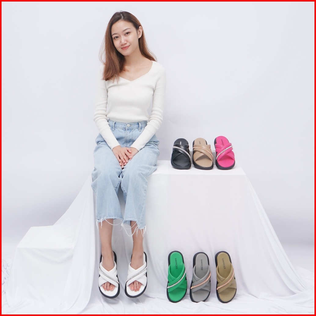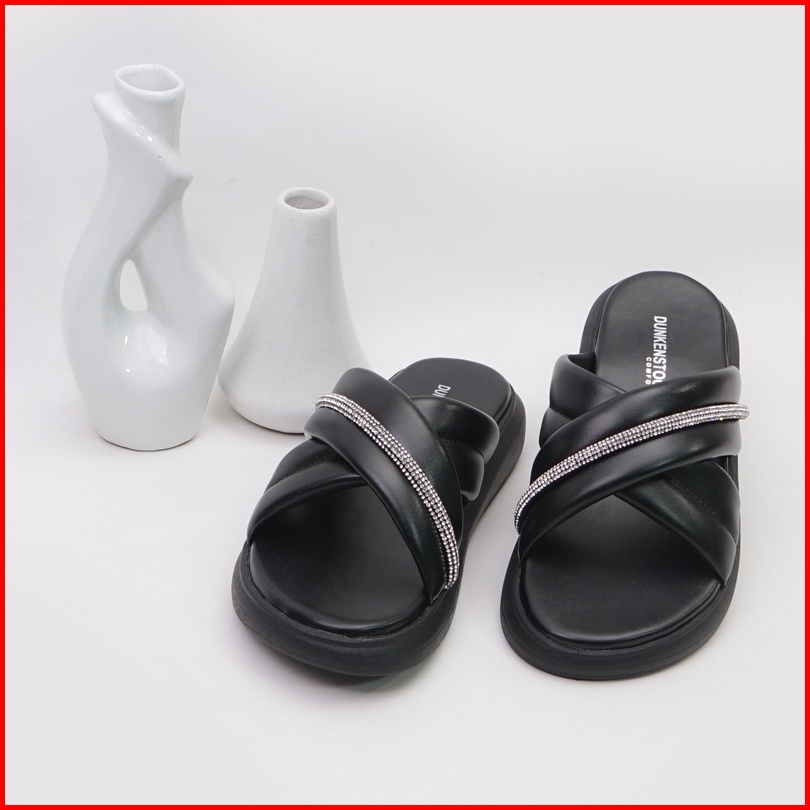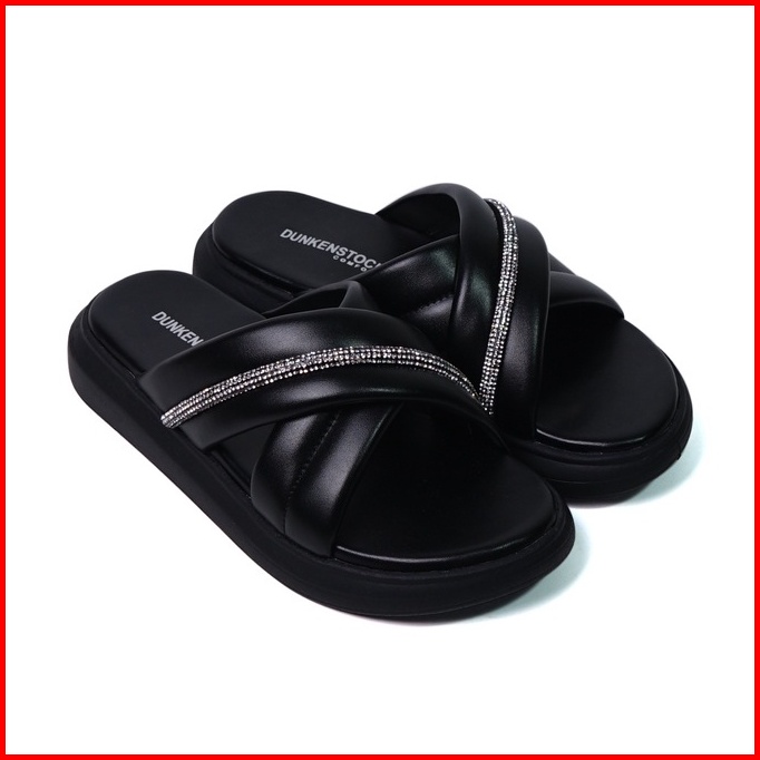 Belleza Mall - Platform Sandals Dunkenstock Monic Black Sandal Wedges Wanita Model Silang Kristal Kekinian Hak Sedang Ti