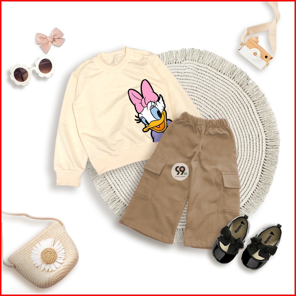 Setelan Pakaian Cargo Anak Perempuan Oversize Daisy Duck Bahan Baby Terry 1-8th