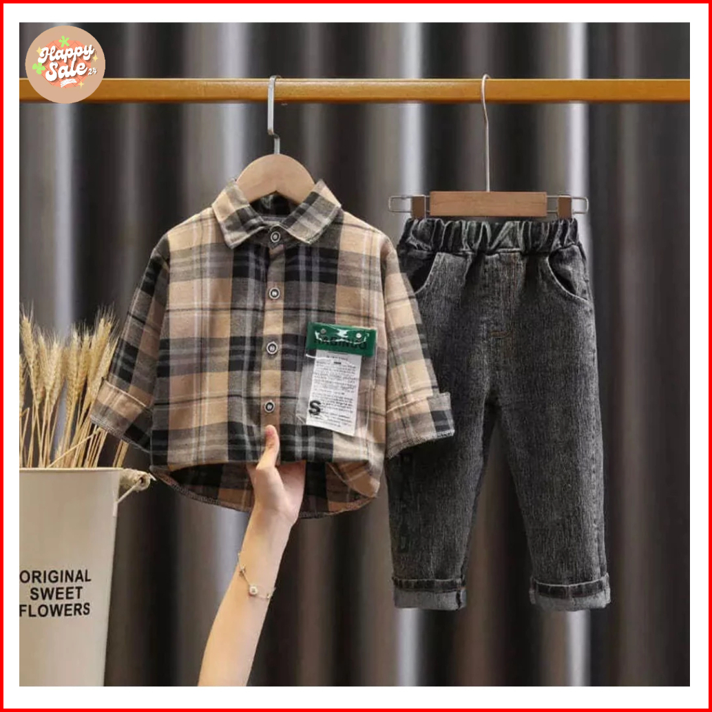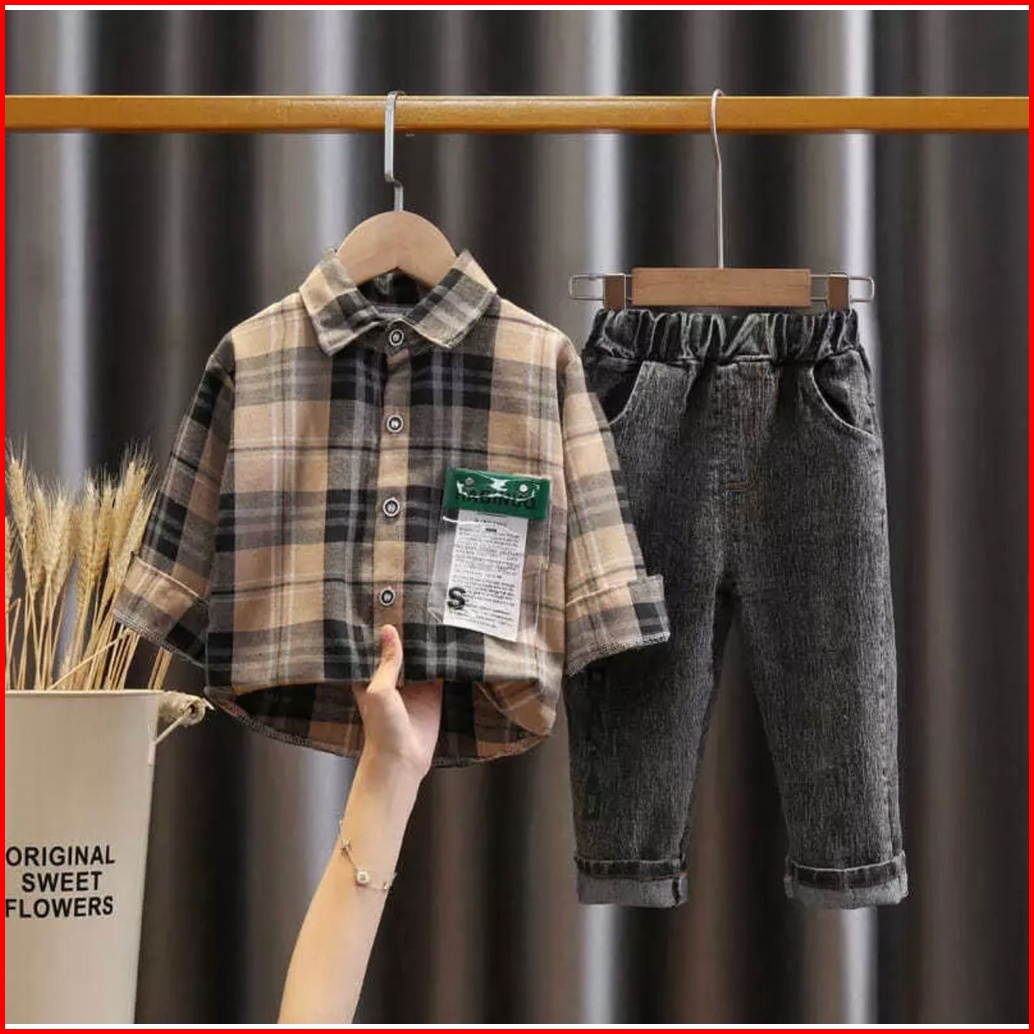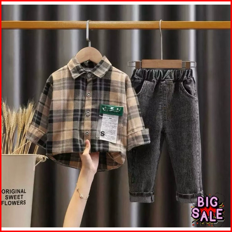 Promo-setelan Anak Kemeja Anak Celana Jeans Anak Usia 1-5 Tahun Setelan Kemeja Flanel Denim Pakaian Anak Laki Laki Terba