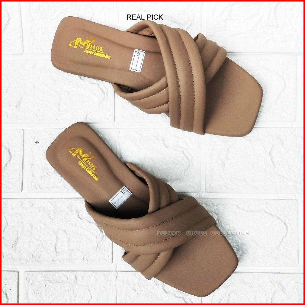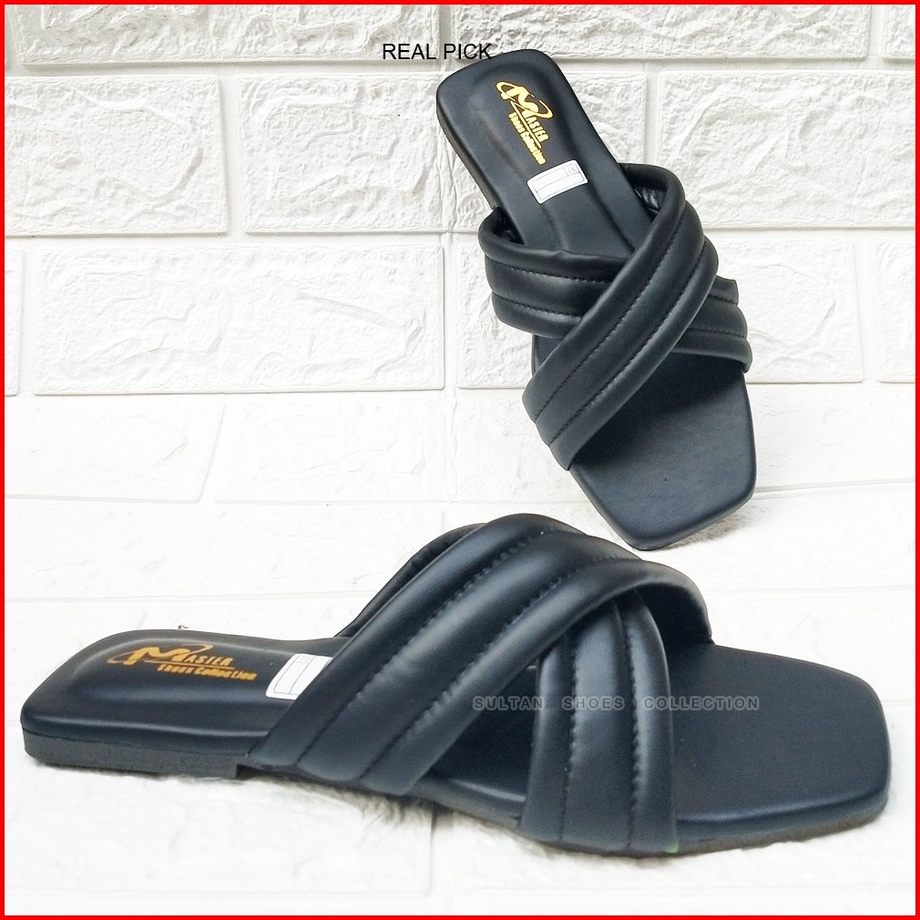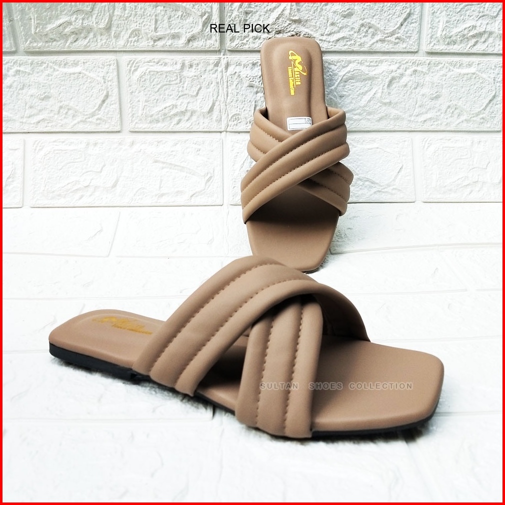Sendal Slop Slip On Wanita Flat Teplek Silang Busa - Sandal Selop Santai Wanita Strap Puffy Kekinian Flat Teplek Silang