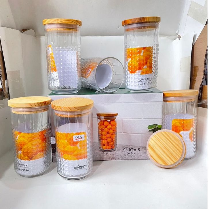 toples kaca Shiga B kedap udara tutup kayu set 6 pcs ukuran 790 ml Terlaris