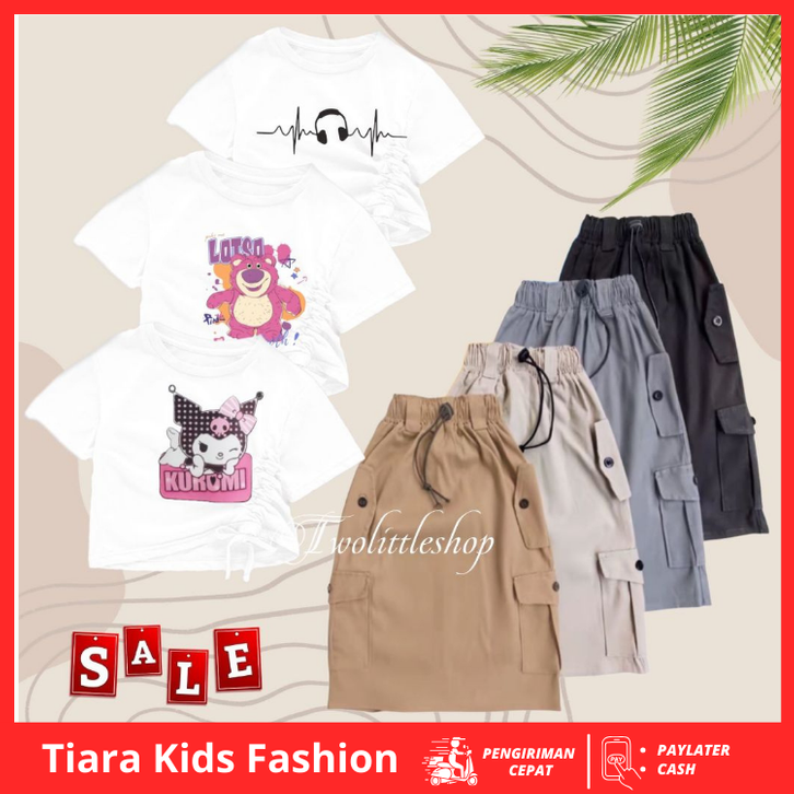 setelan anak perempuan lebaran 2026 one set rok cargo dan atasan anak cewe serut motif headphone lotso kuromi kekinian