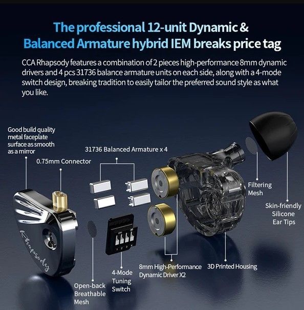 EARPHONE ORIGINAL CCA RHAPSODY 2DD + 4BA HYBRID IEM HIFI EARPHONE