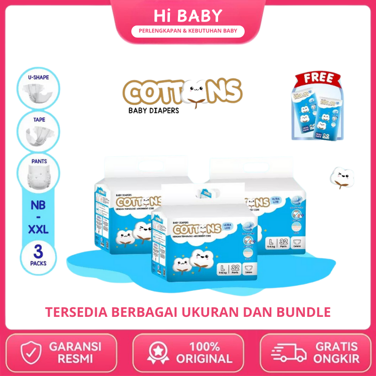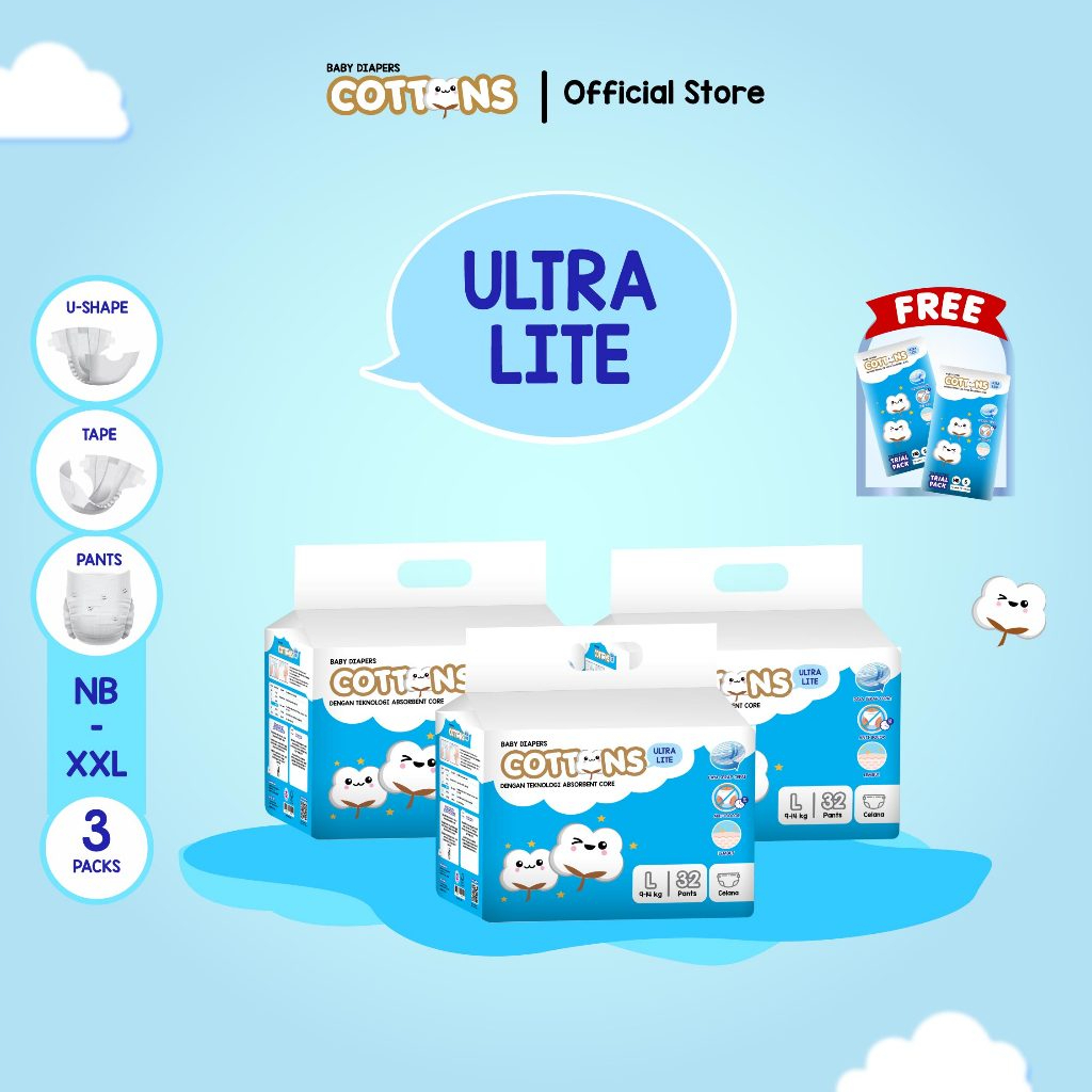 COTTONS BABY DIAPERS ULTRA LITE TAPE NB28 S32 M32 L32 XL30 XXL28 PANTS POPOK BAYI SEKALI PAKAI PEMPES CELANA PEREKAT