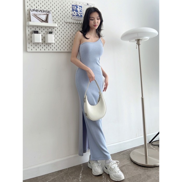 KADAKA D-0235 ONE SHOULDER MAXI KNIT DRESS | BODYCON SLIT DRESS WANITA - DARK ASH, M