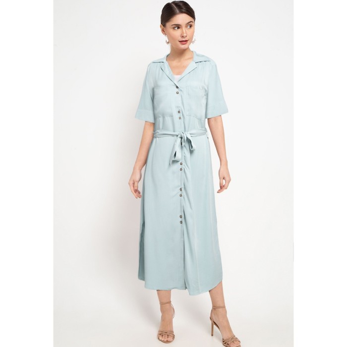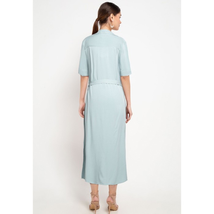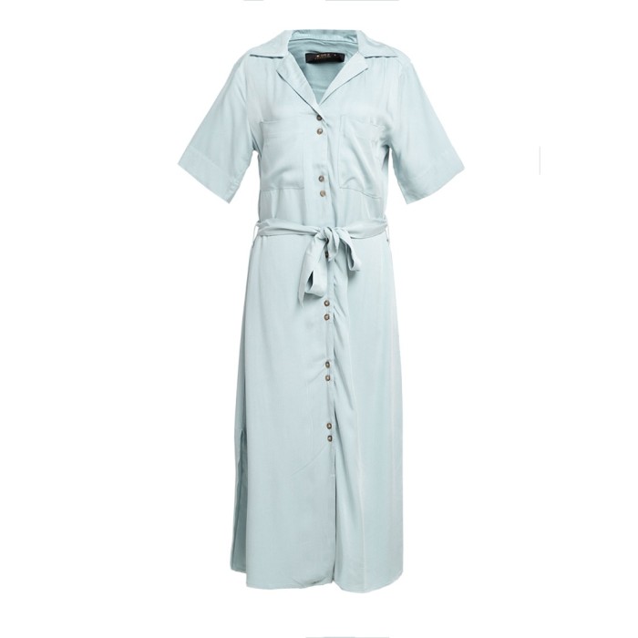 KORZ BOW LAPEL COLLAR MIDI SHIRT DRESS - TURQUOISE - M