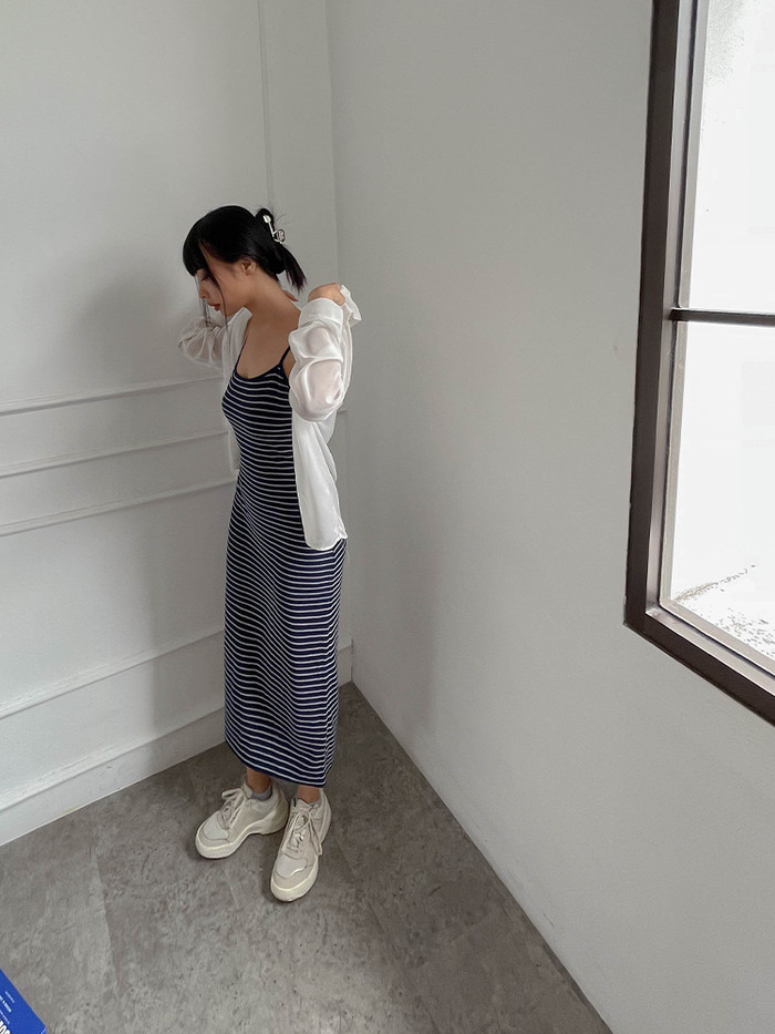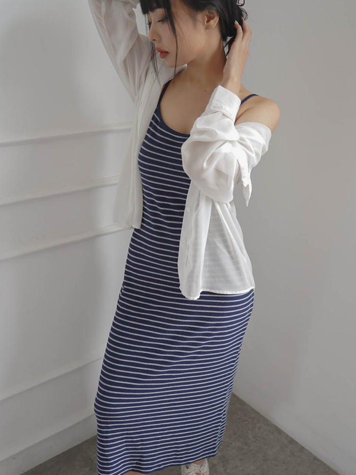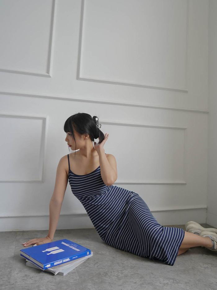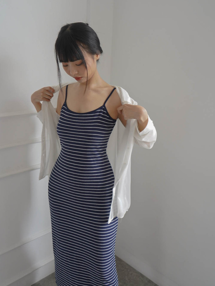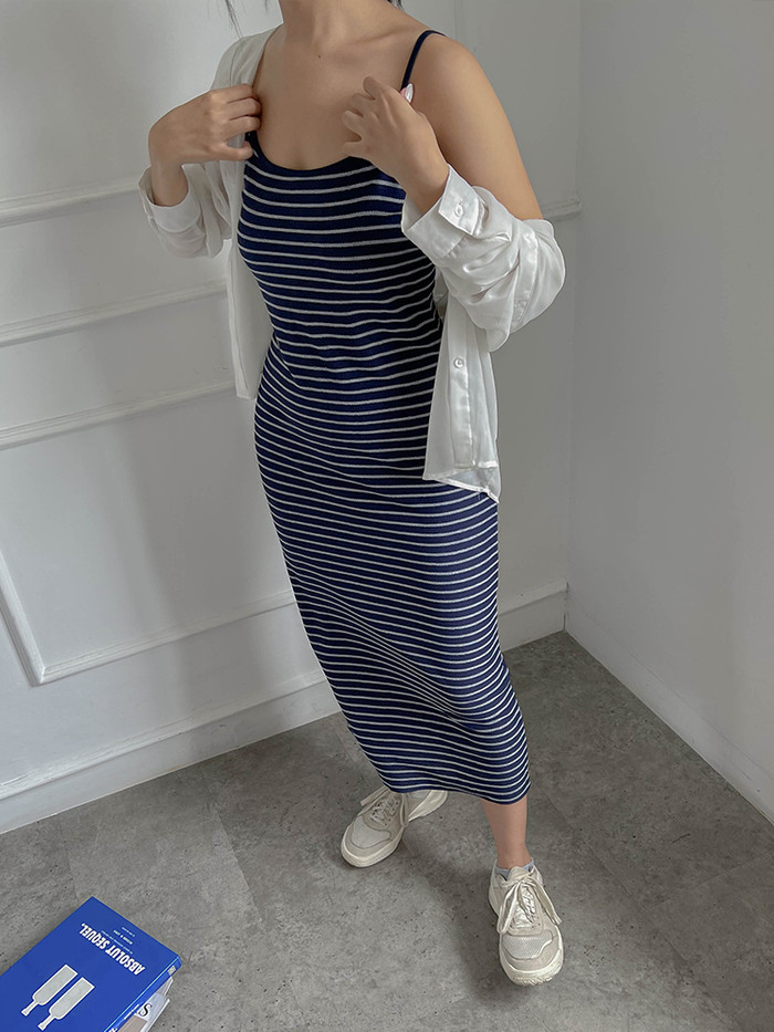 D-0222 MAXI DRESS KNIT SPANDEX STRIPES BODYCON - NAVY STRIPES, S
