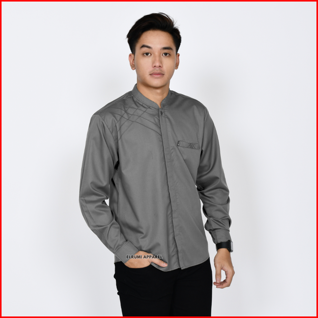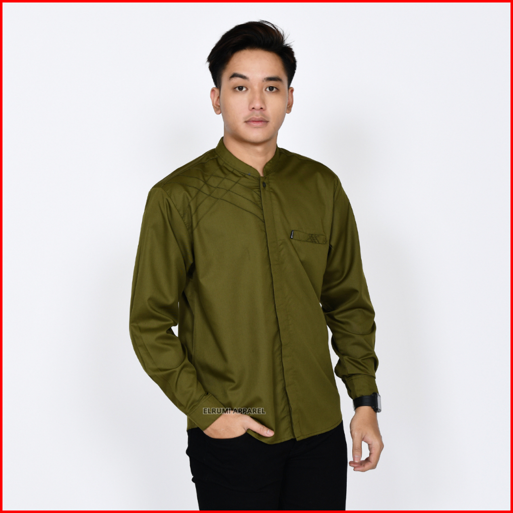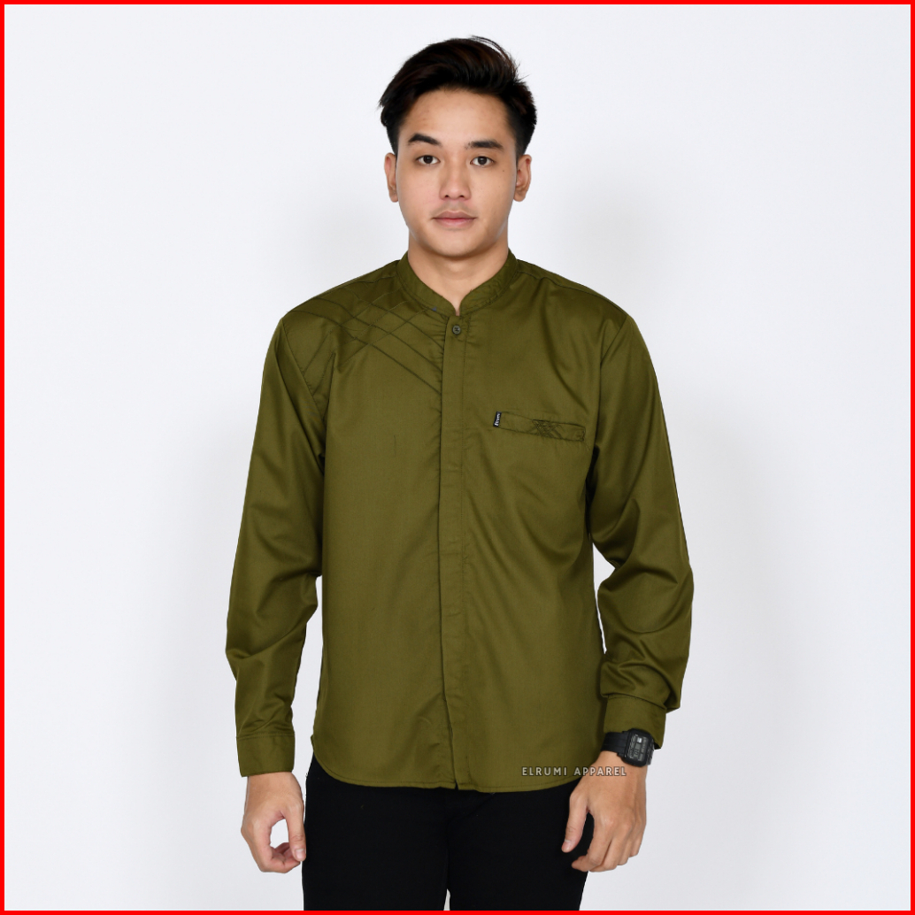 Baju Koko Pria Dewasa Lengan Panjang Warna Olive Motif Signature Original Elrumi
