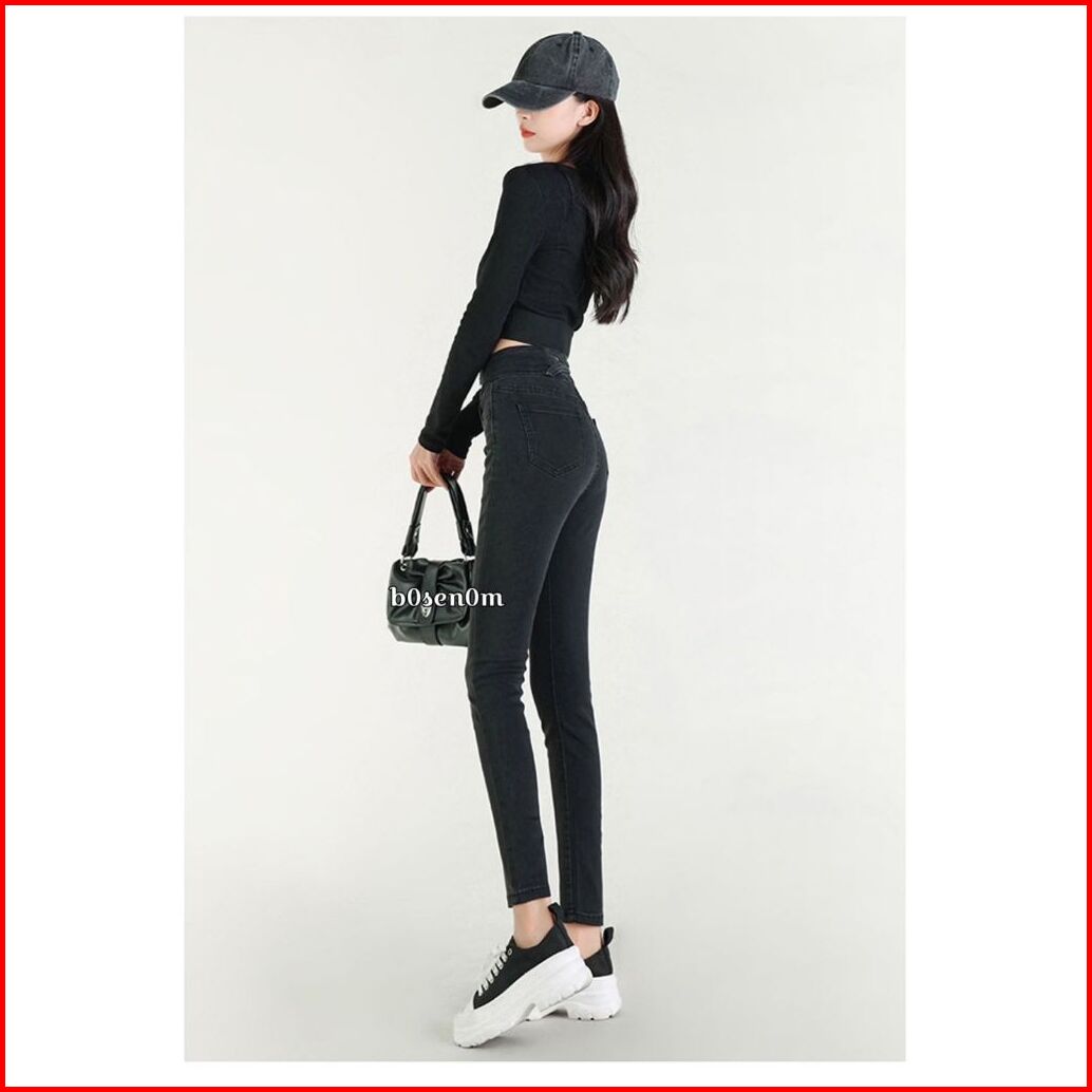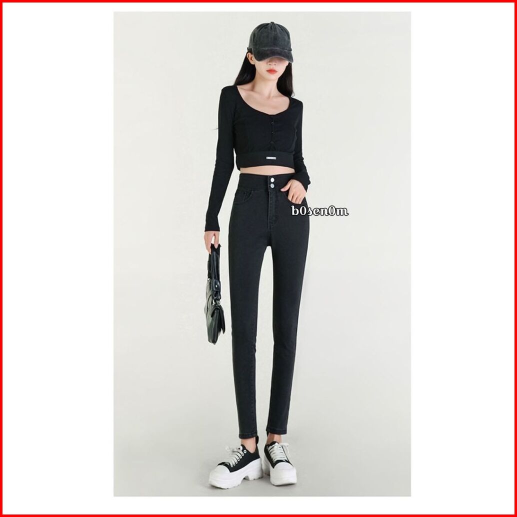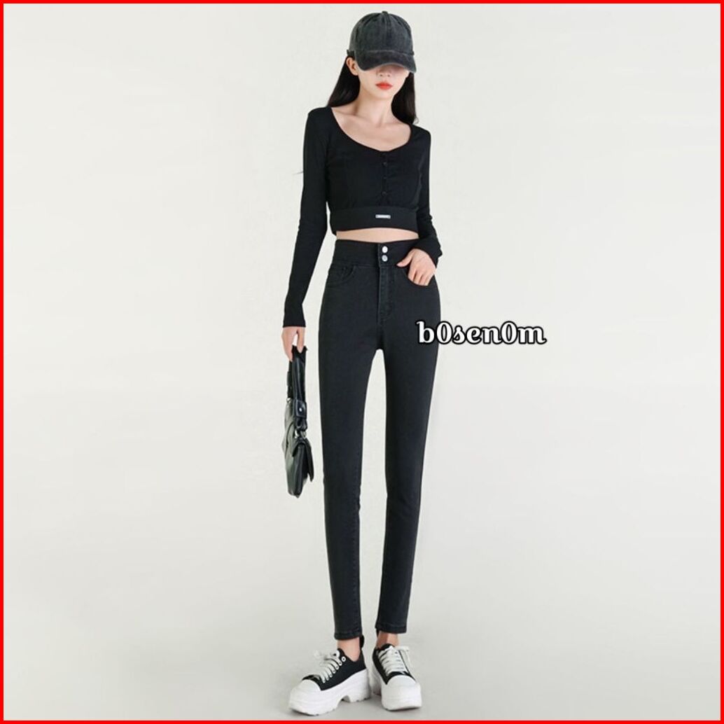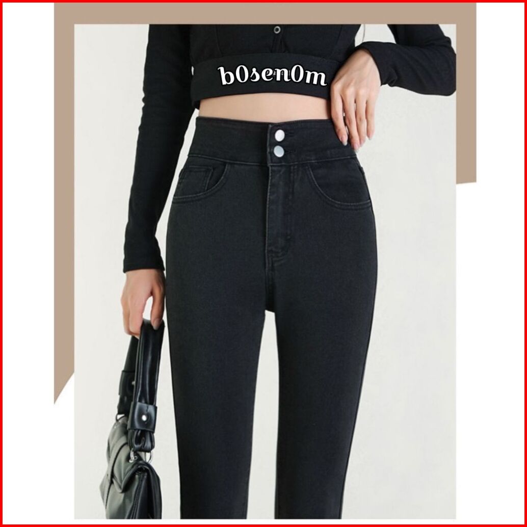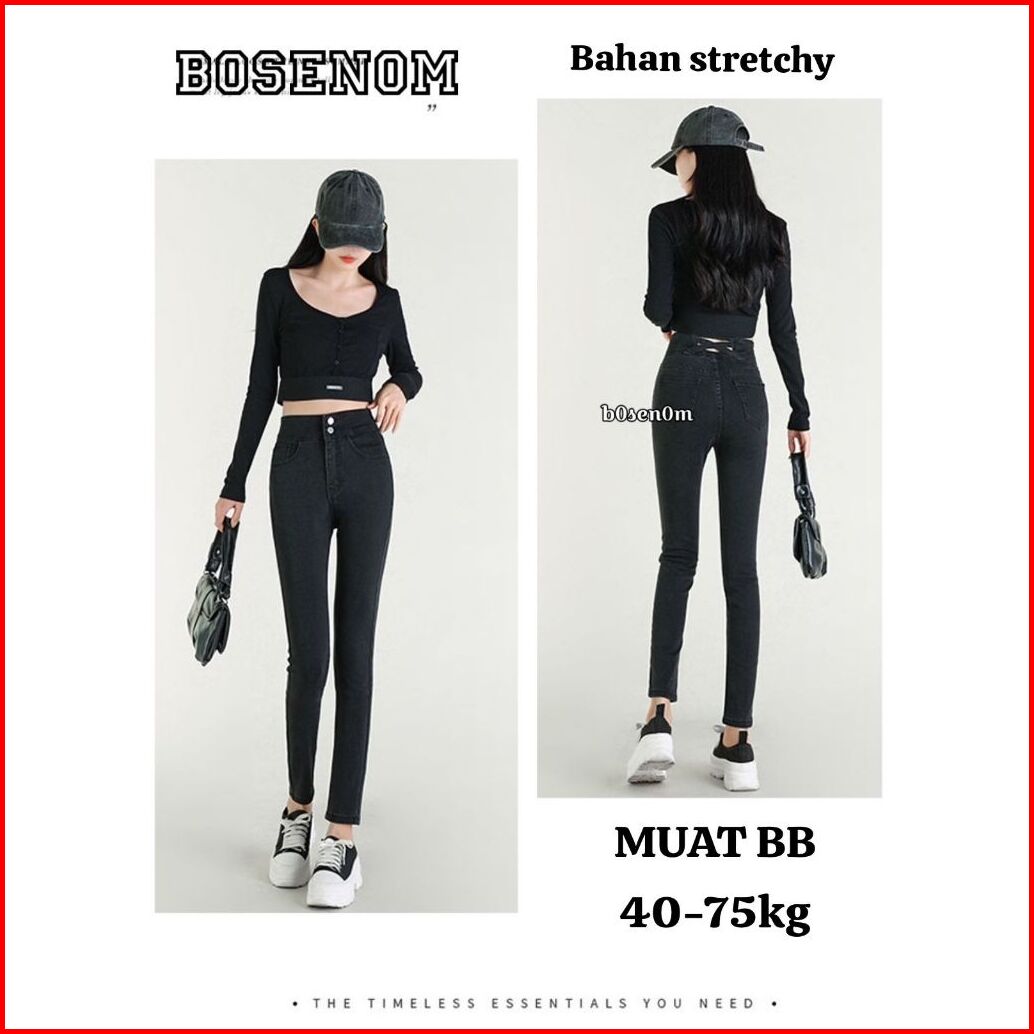 Bosenom- Skinny Jeans Stretchy Hitam Jins Pensil Hitam Highwaist Panjang Wanita Pinggang Silang Pensil Bahan Melar