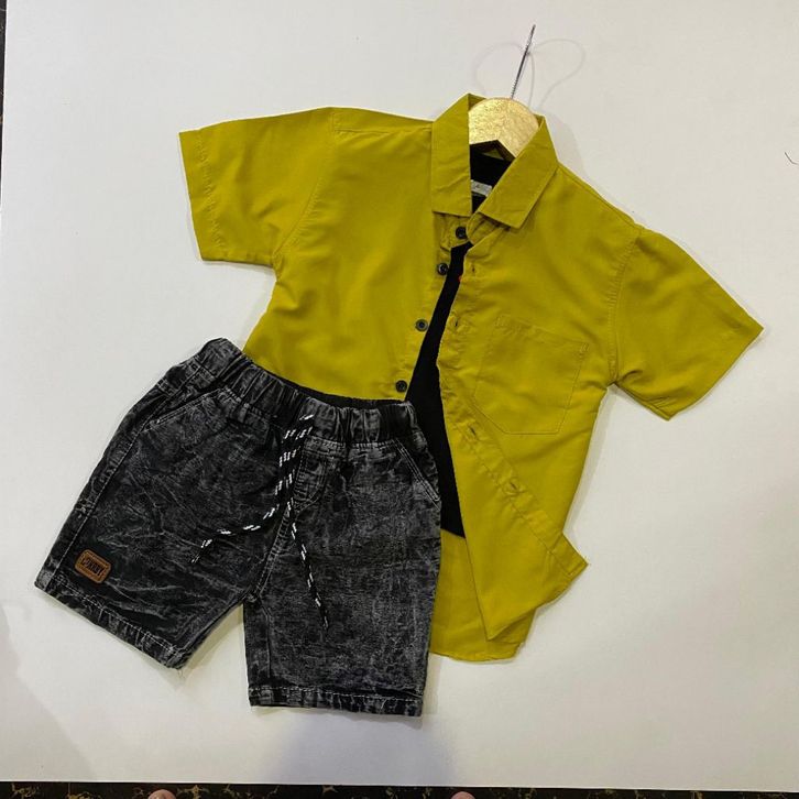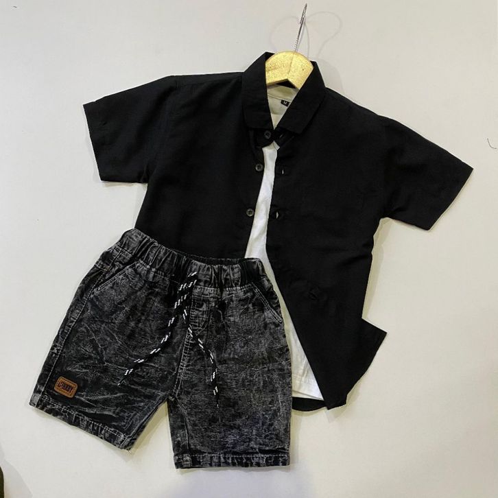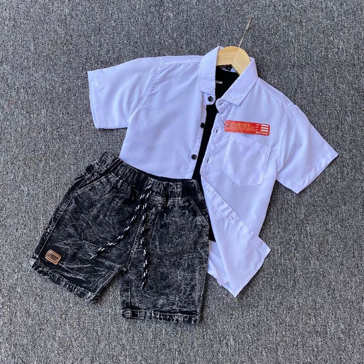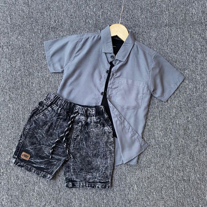 Setelan anak laki laki kemeja polos celana denim broadshort usia 1 2 3 4 5 tahun Baju One Set Lebaran Anak Cowok Terbaru