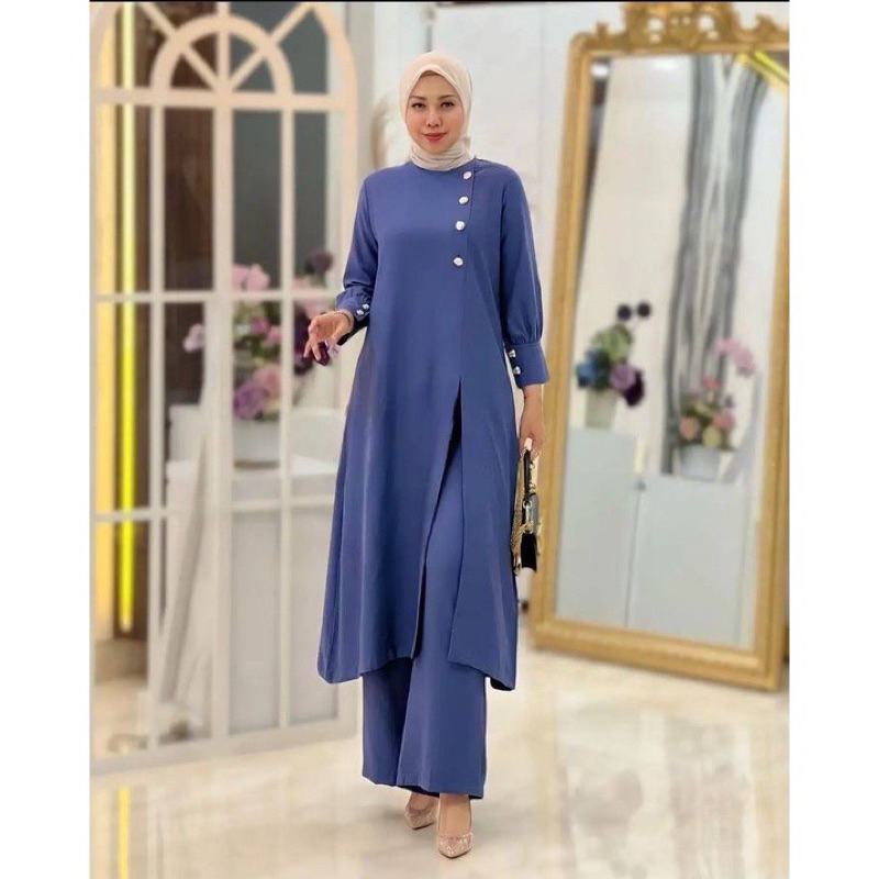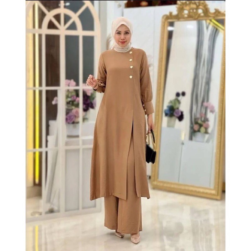 Setelan Long Tunik Wanita Satu Set Celana Kulot Baju Tunik Panjang Fashion Kondangan Formal Jumbo Crinkle Airflow