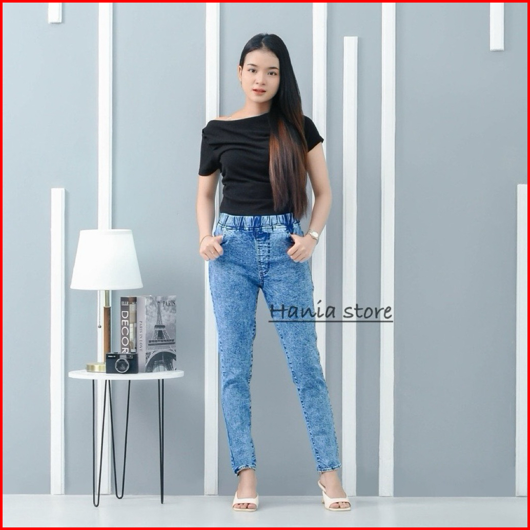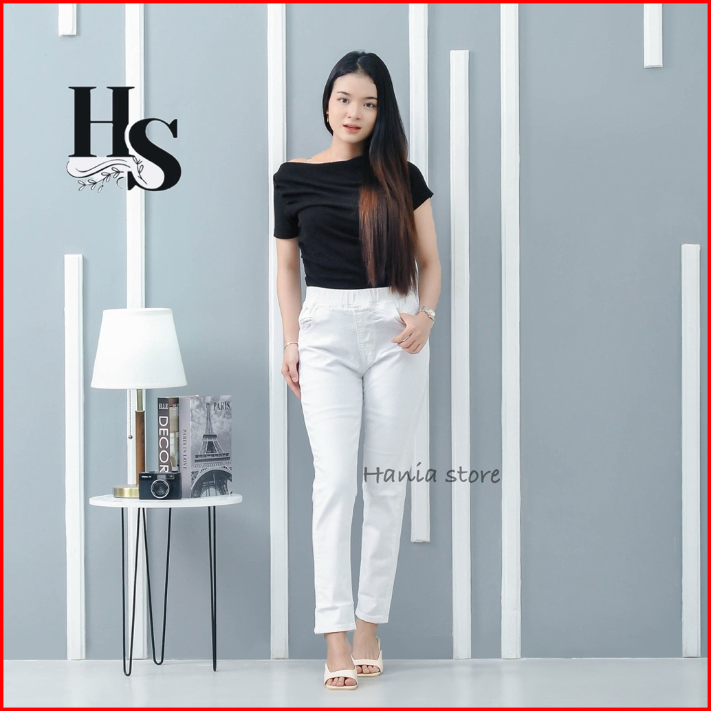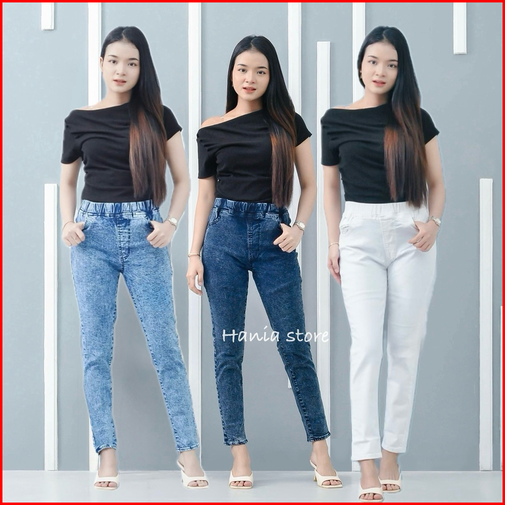 Celana Legging Wanita Jeans Pinggang Karet Super Jumbo Putih Size 27-40