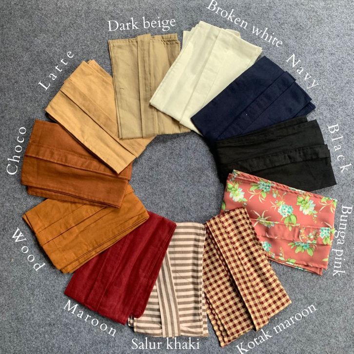 Hitam, Broken white, Bunga pink, Kotak maroon, Salur khaki, Choco, Dark Beige, hitam pita, Navyblue, Wood, latte, Maroon
