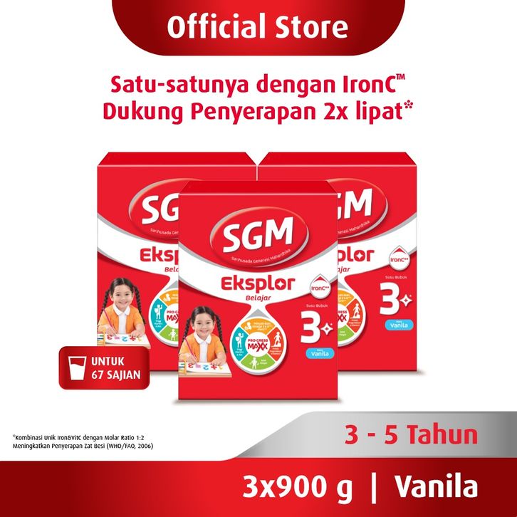 Susu SGM Eksplor 3+ Rasa Vanilla 900GR x 3 Dengan IronC Susu Bubuk Pertumbuhan Anak Usia 3-5 Tahun Susu Formula 3 Plus