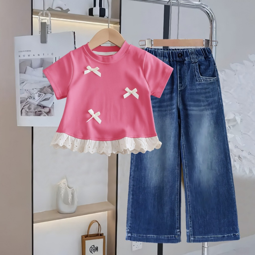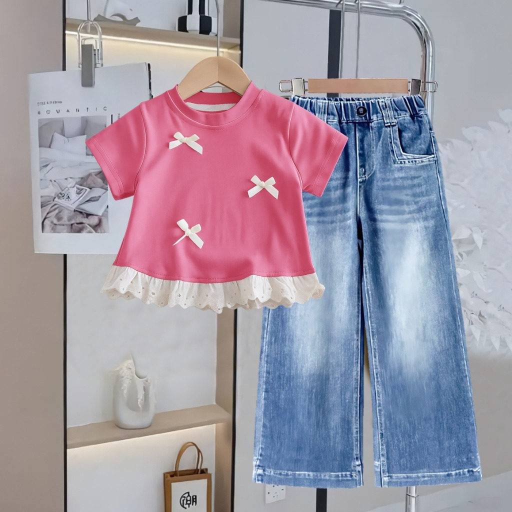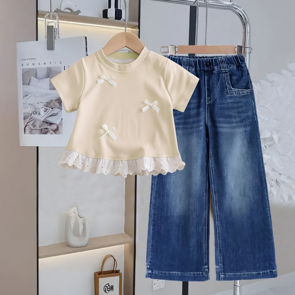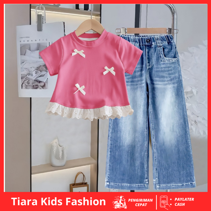 Baju Setelan Anak Perempuan Import 1-12 Tahun Set Kaos Renda Pita Celana Jeans Kulot Anak Cewek Kekinian Terbaru