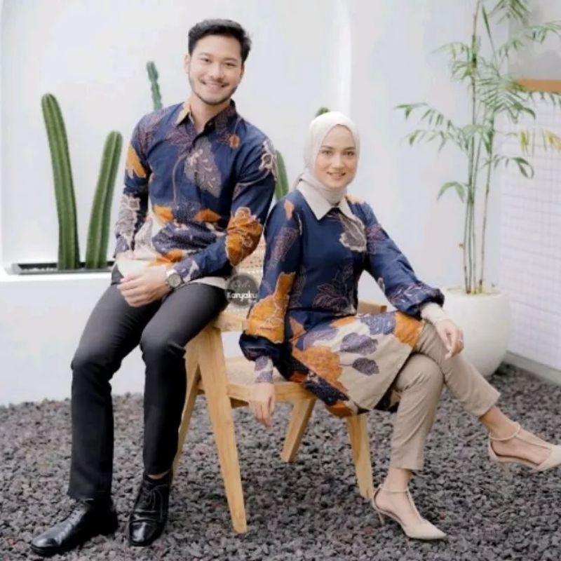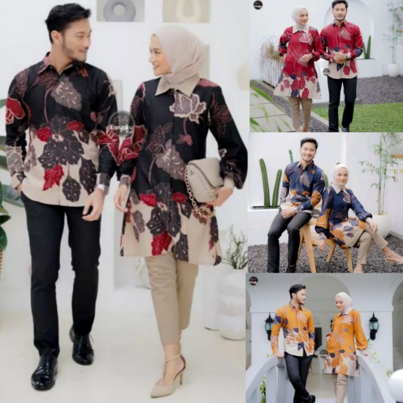 BAJU BATIK COUPLE MODERN KEMEJA TUNIK SET PAKAIAN COUPLE MOTIF MAWAR M L XL XXL