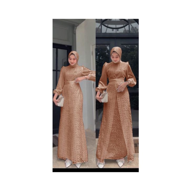 Gamis Malika Bahan Satin Lapis Brukat Premium Sleting Belakang + Obi Lepas( Tali pinggang) Belakang Karet-Tangan