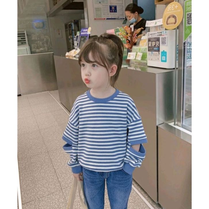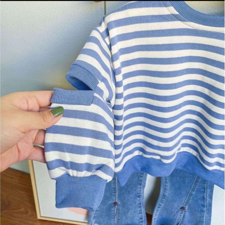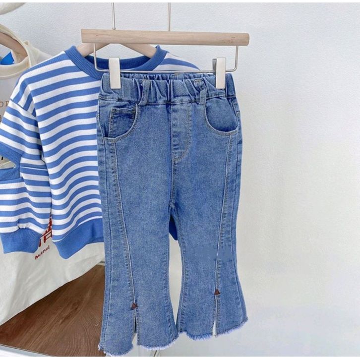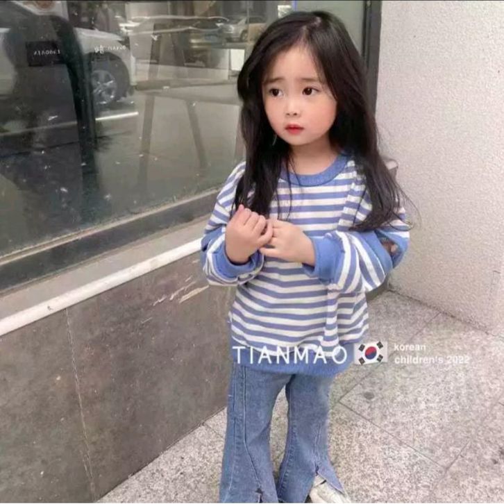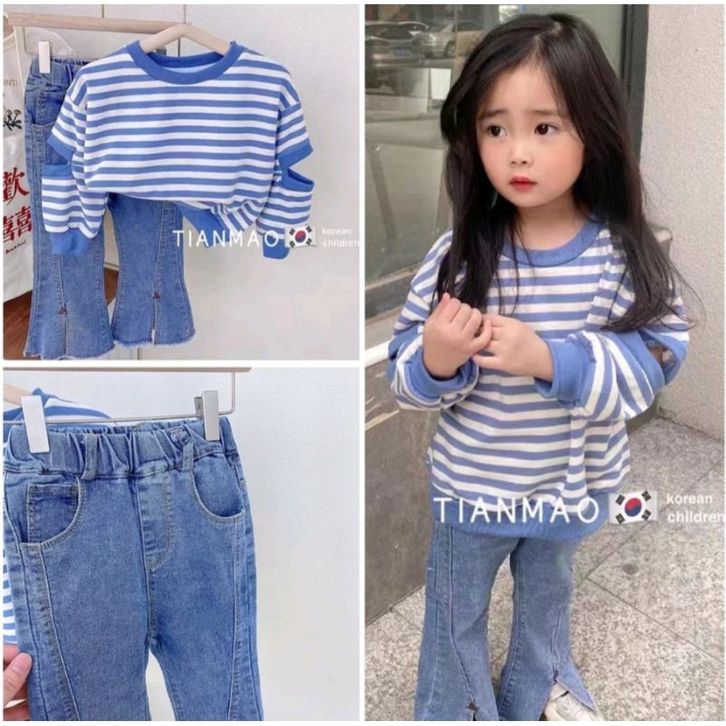 setelan anak perempuan terbaru 2025 one set anak cewek premium atasan salur celana jeans panjang korea style kekinian