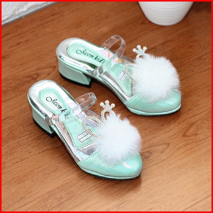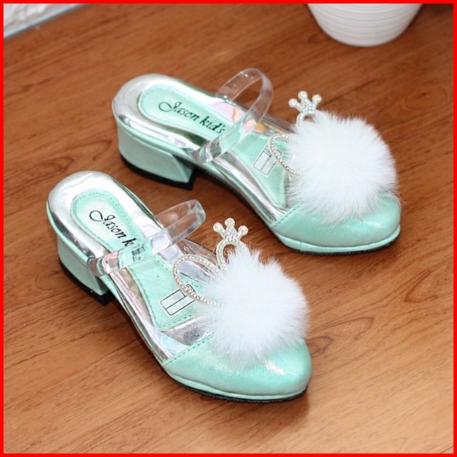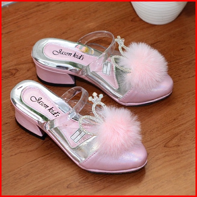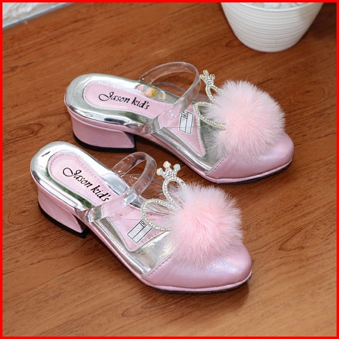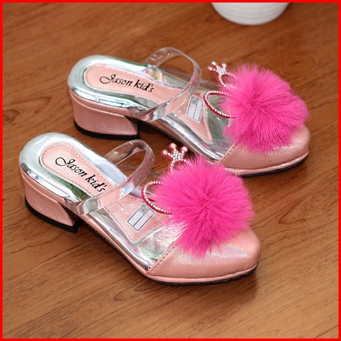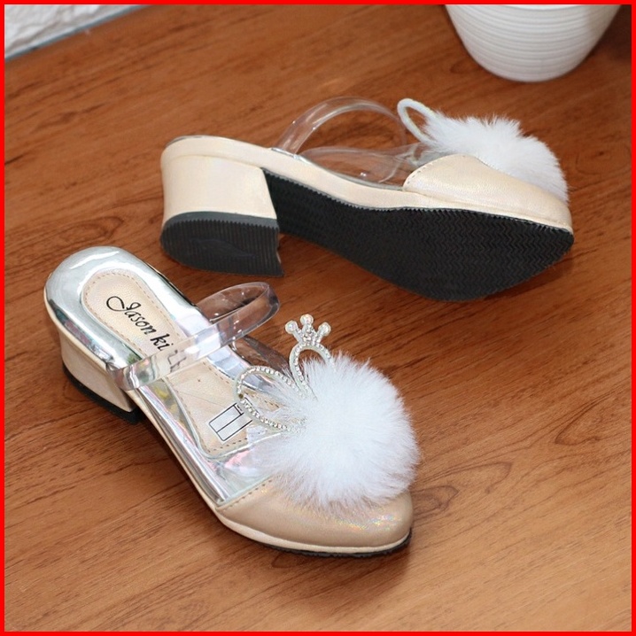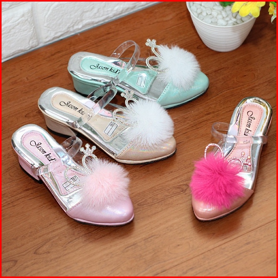 Sandal Sepatu Anak Perempuan Hak 3 Cm Motif Bulu Kitty Mika Bening Heels Selop Pesta Cewe Tahun Sm1