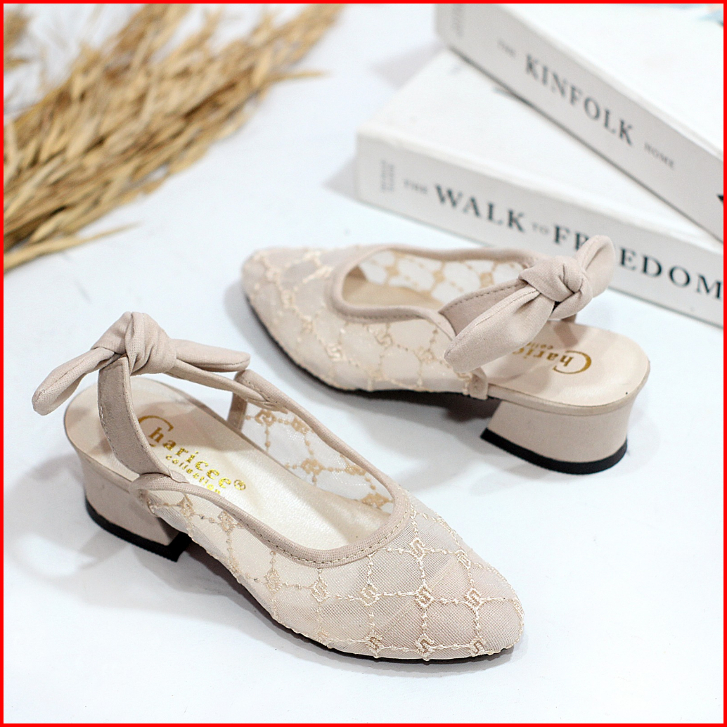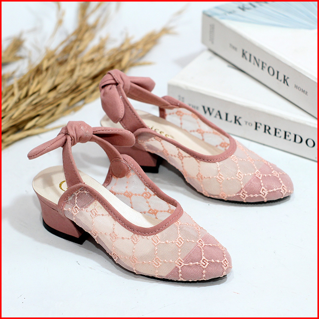 Sepatu Sandal Pesta Anak Perempuan Hak Tahu 3 Cm Brukat Jala Selop Motif Pita