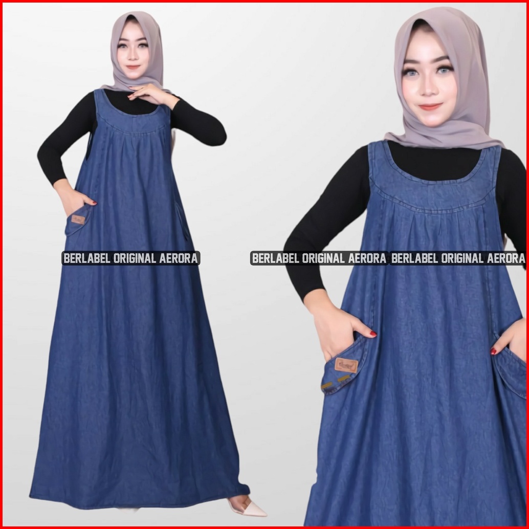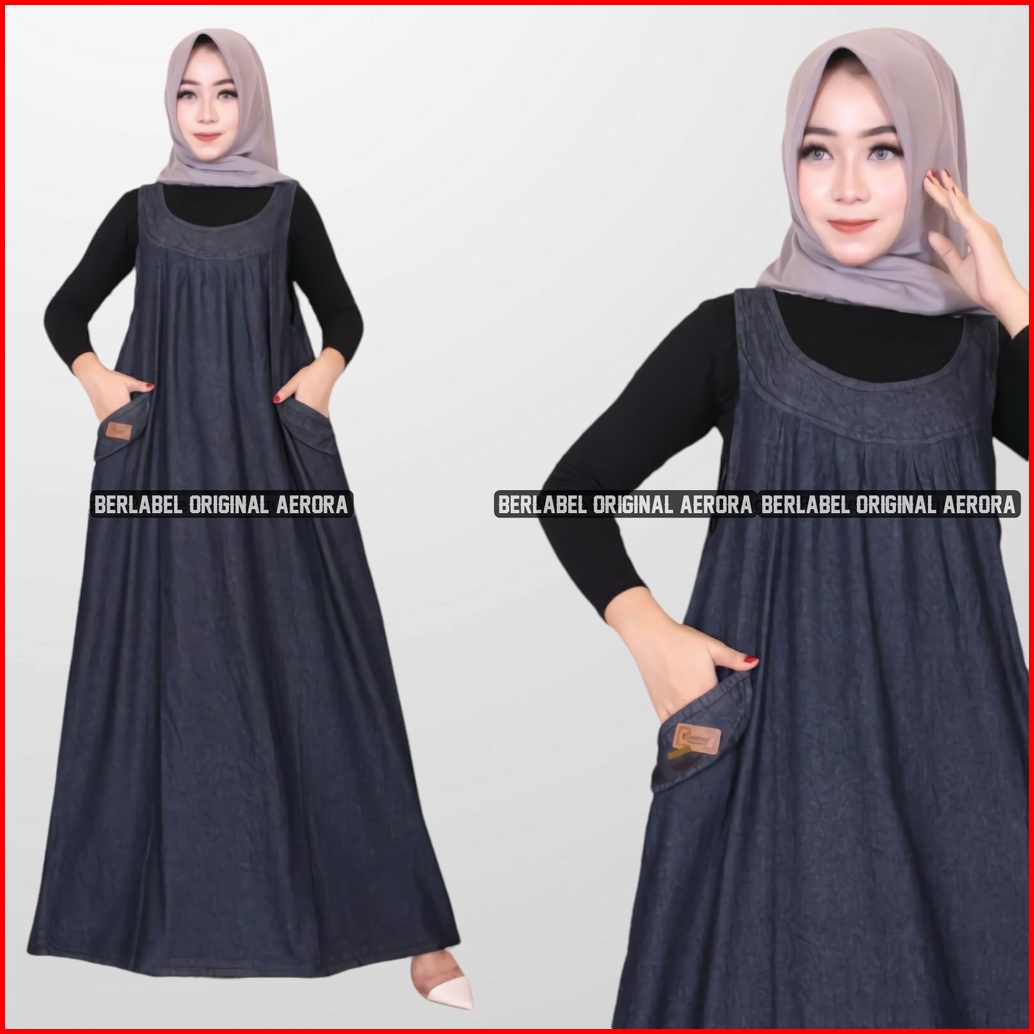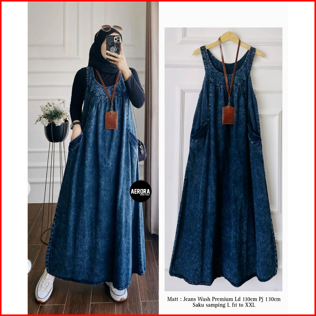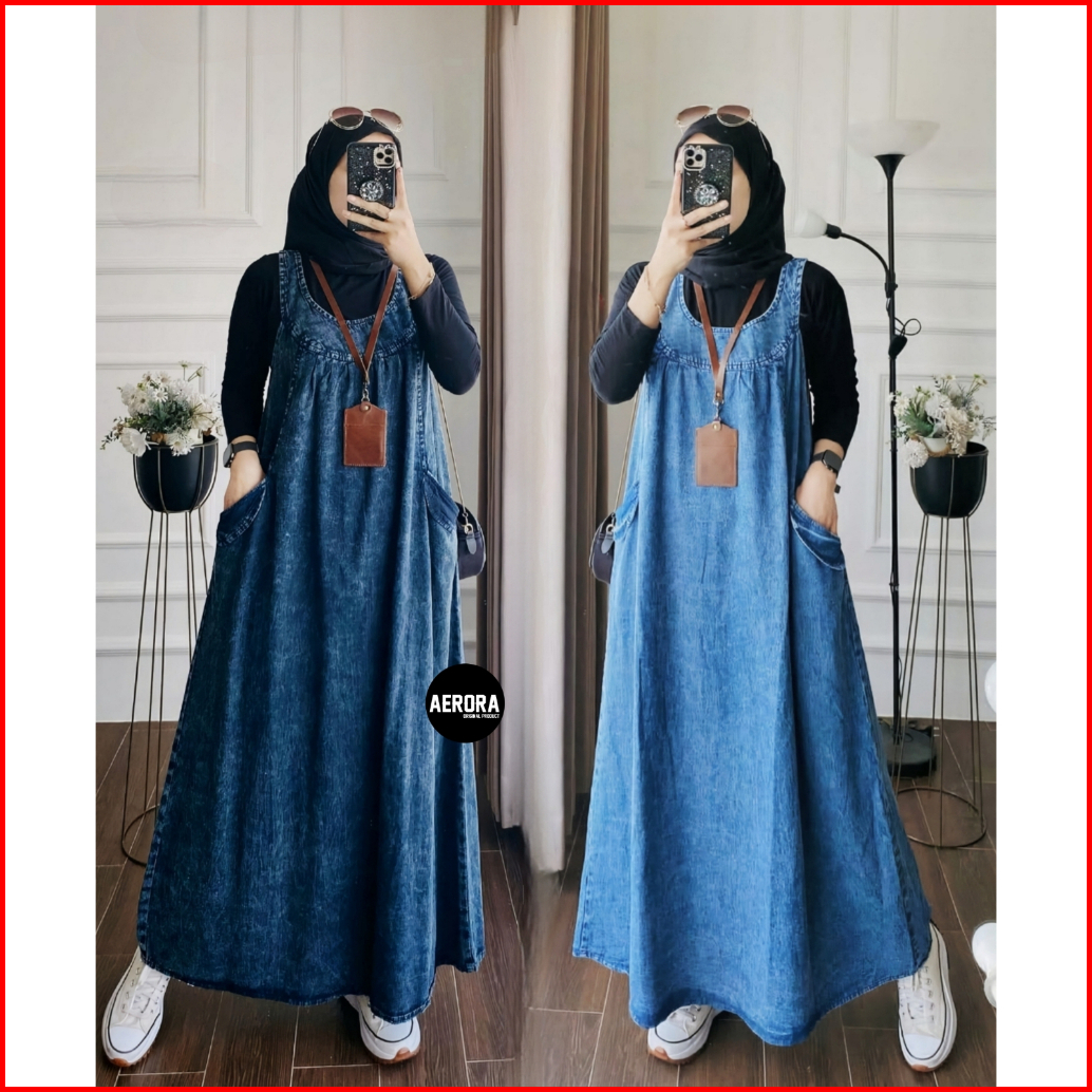 Aerora Baju Kodok Overall Overal Dress Rok Panjang Jeans Wanita Korean Style Polosa Overall Allsize