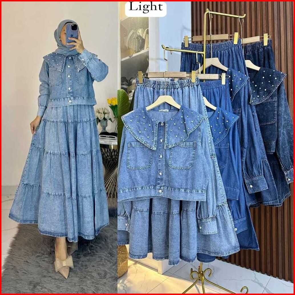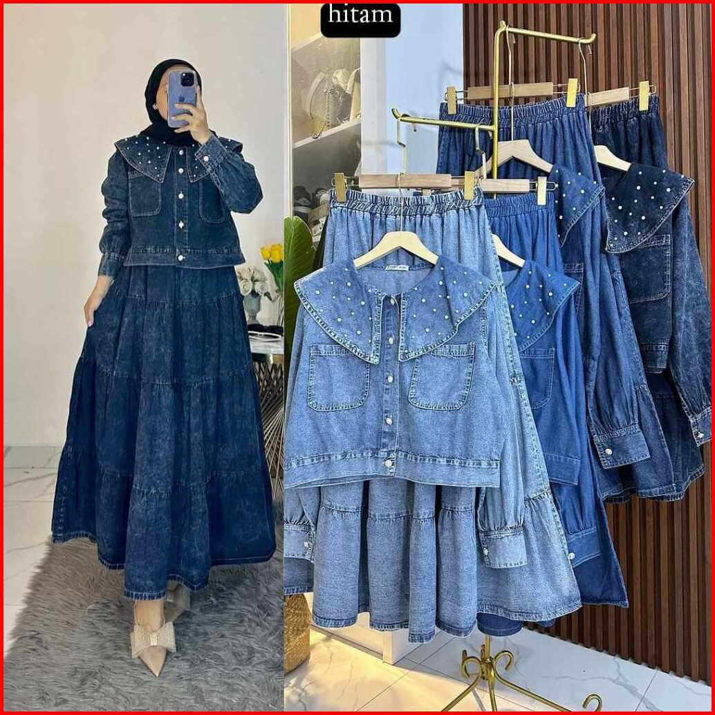 Gamis Set Matt Jeans Aplikasi Mutiara Baju Set Atasan Rok Bahan Jeans Premium Dress Wanita Remaja